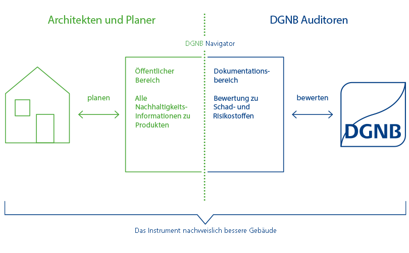 Der DGNB Navigator ist das zentrale Werkzeug, welches bei der Produktprüfung des DGNB System Kriteriums ENV1.2 (Risiken für die lokale Umwelt) Unterstützung leistet. Für DGNB Auditoren wurde ein separater Dokumentationsbereich geschaffen, in dem Produkte gefunden und selbst anlegen werden können und zusätzlich ein Projektbereich zur Verfügung steht.
