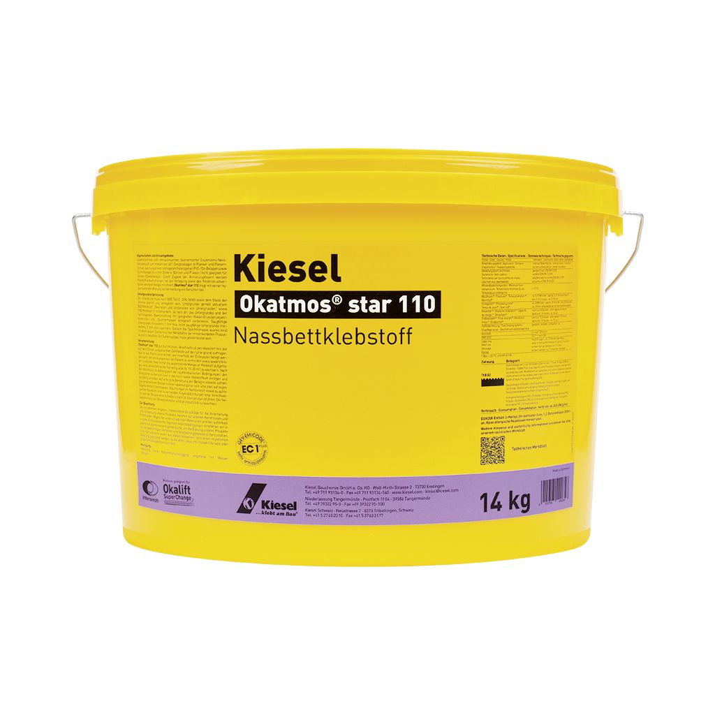 Okatmos® star 110 gut durchrühren.Anschließend den Klebstoff mit der auf dem Deckel aufgebrachten Zahnleiste auf den Untergrund auftragen. Nur so viel Fläche einstreichen, wie innerhalb der Einlegezeit belegt werden kann. Um ein Auskämmen der Fasern zu vermeiden sowie gewährleisten zu können, dass immer die ausreichende Menge an Klebstoff aufgetragen wird, ist die Zahnleiste frühzeitig (alle ca. 15-20 m²) zu wechseln.