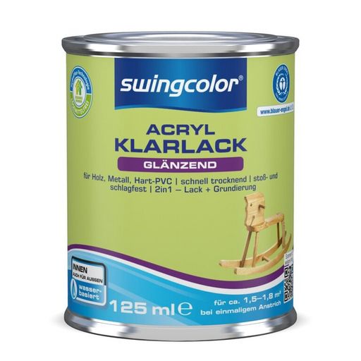 Der swingcolor® Acryl Klarlack glänzend ist ein wasserbasierter Acrylat-Lack, der vor allem durch seine Wetterbeständigkeit sowie seine Stoß- und Schlagfestigkeit besticht. Er ist nicht nur schnell trocknend und leicht zu verarbeiten, sondern auch vergilbungsbeständig. swingcolor® Acryl Klarlack glänzend kann dabei als direkte Lackierung auf Holz oder als transparenter Überzugslack auf zum Beispiel mit swingcolor® Acryl Buntlack lackierten Flächen zur Verbesserung der mechanischen Oberflächenbelastbarkeit dienen.Geeignet als Lackierung direkt auf Holz oder als transparenter Überzugslack auf lackierten Flächen (z. B. mit swingcolor® Acryl Buntlack) auf z. B. Fenstern, Türen, Profilhölzern, Vertäfelungen, Paneelen, Garagentoren, Zäunen.