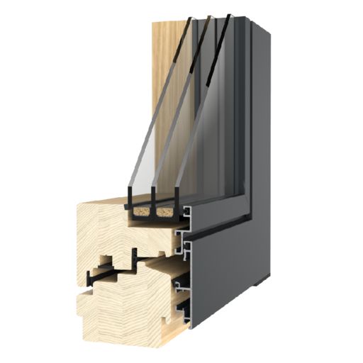 Holzalufenster 79 ( inkl. Alu 96 mm ) Bautiefe Rahmen mit Dreifachverglasung mit Ug = 0,5 W/m2K und Uw = 0,74/m2K. Das spezielle Wärmedämmglas lässt kaum Wärme raus, aber 54% der Sonnenwärme herein. Schallschutzwerte von 35 dB (optional bis 46 dB)…