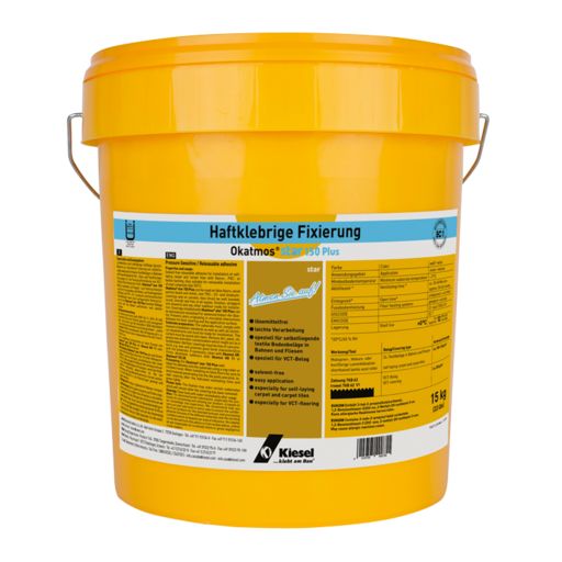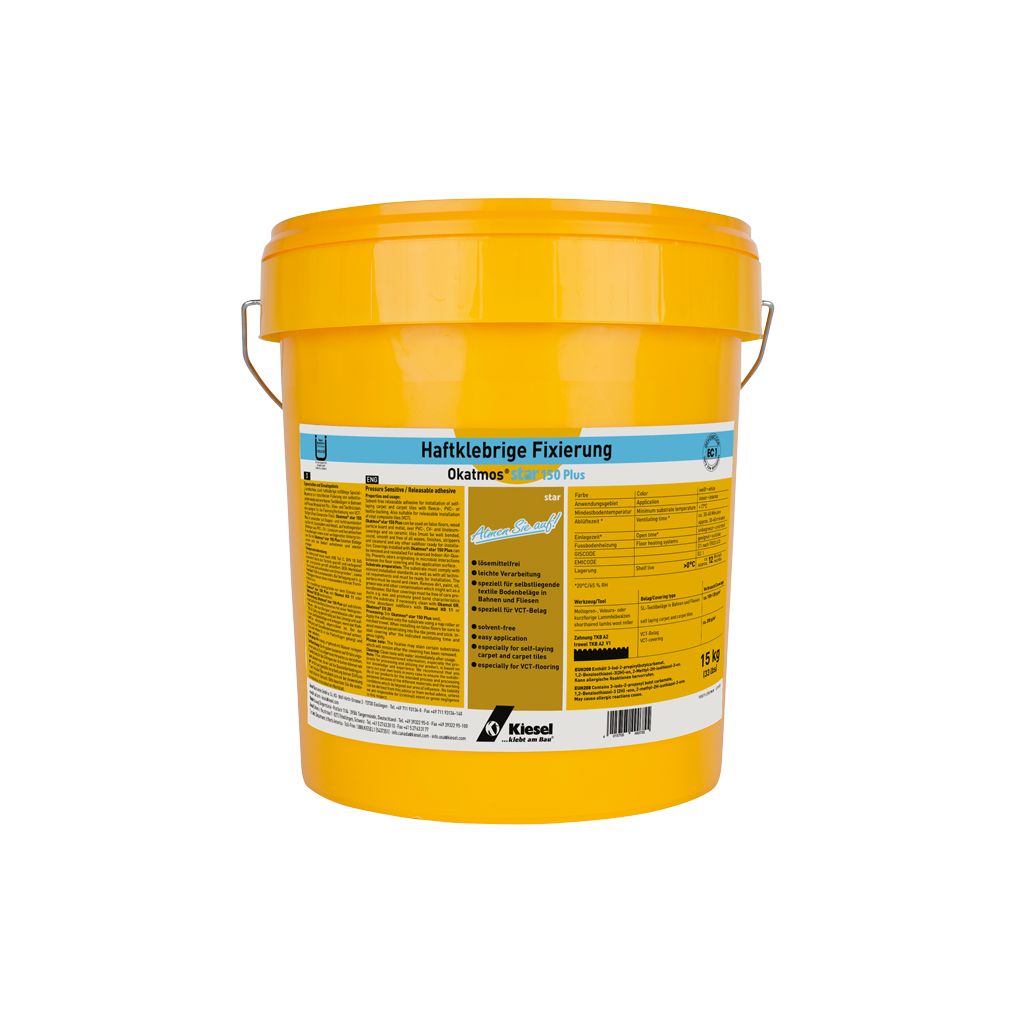 Lösemittelfreie, stark haftklebrige, rollfähige Spezial-Dispersion zur rutschfesten Fixierung von selbstliegenden, wieder aufnehmbaren Textilbelägen in Bahnen und Fliesen (Module) mit Filz-, Vlies- oder Textilrücken. Auch geeignet für die Fixierung/Verklebung von VCT-Belägen (Vinyl-Composite-Tiles). Okatmos® star 150 Plus ist einsetzbar auf Doppel- und Hohlraumboden aus Estrich, Spanplatten und Metall, auf festliegenden Altbelägen aus PVC-, CV-, Linoleum und keramischen Fliesenbelägen sowie allen verlegereifen Untergründen.Die mit Okatmos® star 150 Plus fixierten Beläge lassen sich bei Bedarf aufnehmen und wieder einlegen.
