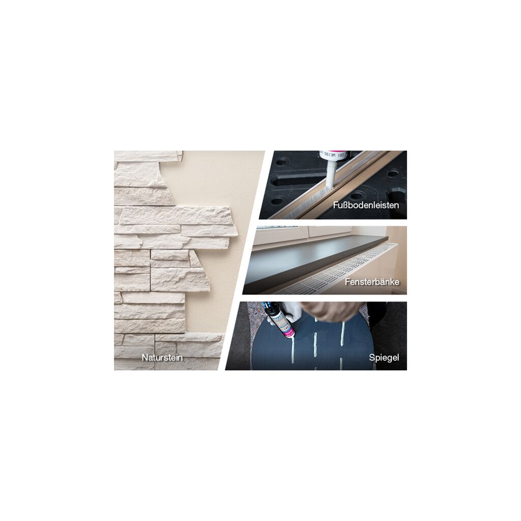 AnwendungsgebieteKleben von Stein, Naturstein und KeramikKleben von Wandverkleidungs-/Dekor-Platten im Innenbereich z.B. im Sanitär-, Küchen- und Gastrobereich oder in KühlzellenKleben von Fensterbänken, Fußbodenleisten, Zierleisten und TreppenstufenKleben von Spiegeln auf Keramik, Glas, Kunststoff, Edelstahl, Aluminium, Holz, Beton etc.Kleben und Montieren unterschiedlichster Materialien wie Holz, Holzwerkstoffe, Kunststoffe, Metalle und mineralische UntergründeKleben im lebensmittelnahen BereichEigenschaftenExtrem hohe Anfangshaftung - Keine Fixierung erforderlichNatursteinverträglich - Verursacht keine Verfettung an NatursteinenHaftet auch auf feuchten UntergründenElastisch - Gleicht Bewegungen ausÜberstreichbar / Überlackierbar - bitte Anwendungshinweise im technischen Datenblatt beachtenSilikonfreiIsocyanatfreiNormen und PrüfungenEntspricht den Anforderungen des Brandverhaltens nach EN 13501: Klasse EUnbedenklichkeitserklärung - geprüft für den Einsatz im lebensmittelnahen Bereich (ISEGA Forschungs- und Untersuchungs-Gesellschaft mbH, Aschaffenburg)EMICODE® EC 1 Plus - sehr emissionsarmFranzösische VOC-Emissionsklasse A+Deklaration in Baubook ÖsterreichFür Anwendungen gemäß IVD-Merkblatt Nr. 30+35 geeignetDocuments