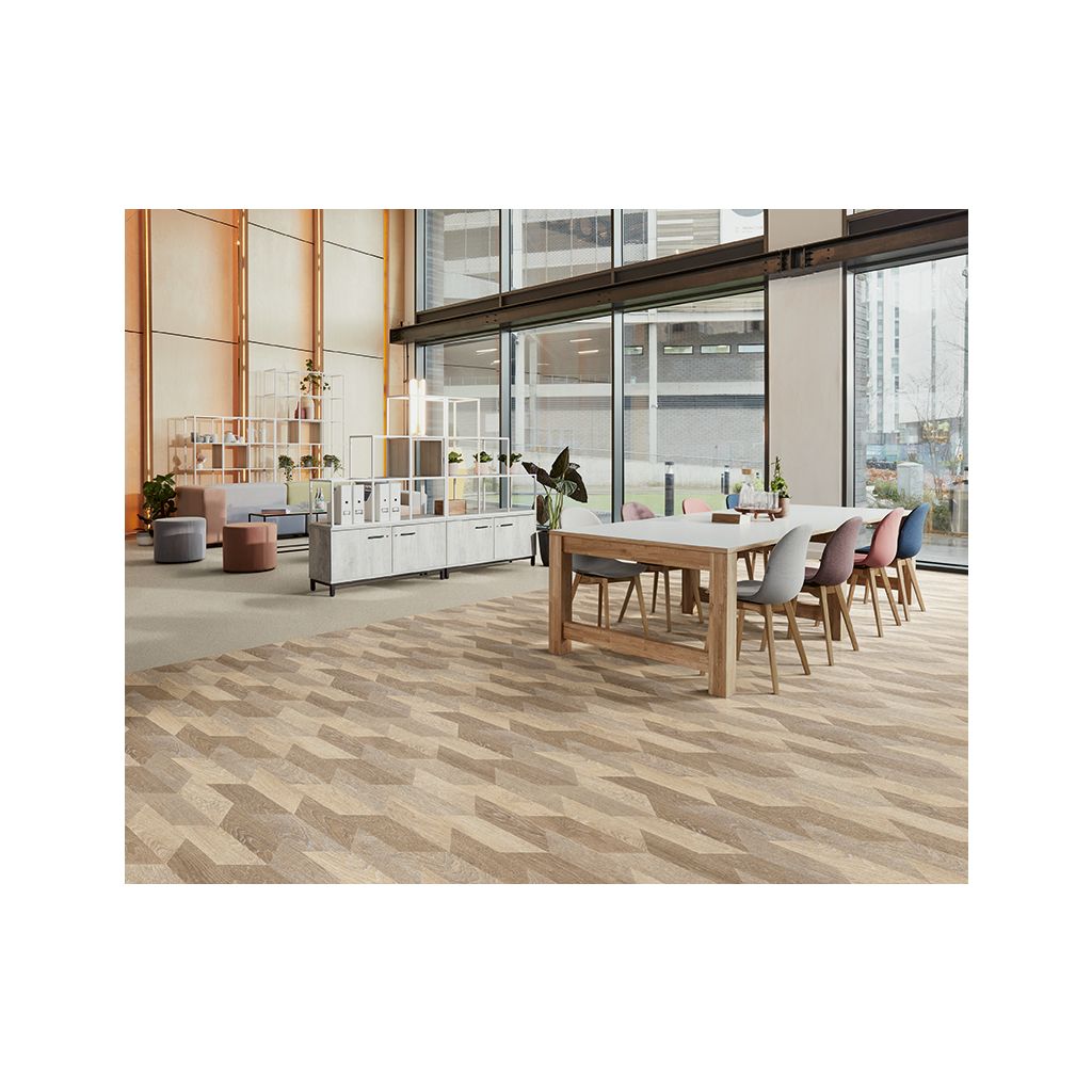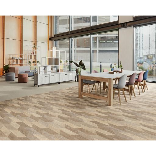 Heterogener lose liegender und wiederverwenbarer PVC-Bodenbelag in Fliesen und Planken. Einsatz zum Beispiel im Retail-Bereich, in Hotels oder Büro- und Verwaltungsgebäuden.