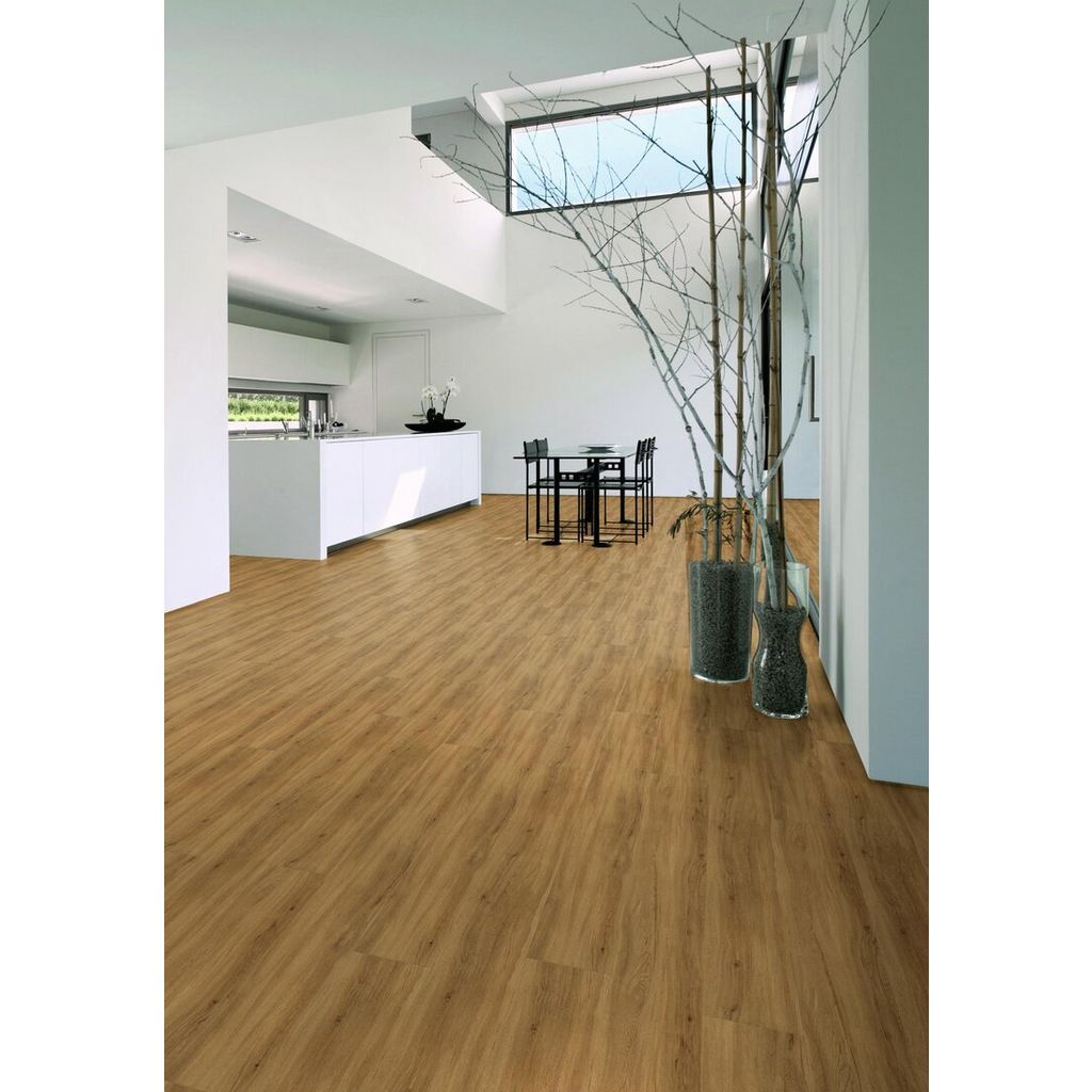 Heterogener PVC-Bodenbelag in Fliesen und Planken auf Basis einer fototechnischen Reproduktion mit transparenter Nutzschicht und werkseitig aufgebrachter Polyurethan-Vergütung für den Einsatz im strapaziertem Wohnbereich.