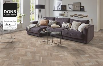 Heterogener PVC-Bodenbelag in Fliesen und Planken auf Basis einer fototechnischen Reproduktion mit transparenter Nutzschicht und werkseitig aufgebrachter Polyurethan-Vergütung für den Einsatz im strapaziertem Wohnbereich.