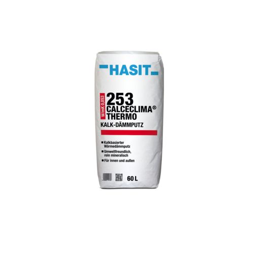 HASIT 253 CalceClima® Thermo Kalk-Dämmputz bietet sich als ökologischer, das Raumklima regulierender Kalk-Wärmedämmputz für alle Aufgaben an, wo auf Wohnbaubiologie Wert gelegt wird. Er ist im Innen- und Außenbereich bei Alt- und Neubauten einsetzbar. Wärmedämmputz nach DIN EN 998-1 mit rein mineralischen Leichtzuschlägen und der Wärmeleitgruppe WLG 055 (gemessen nach ISO 8301). Entspricht der technischen Spezifikation Wärmedämmputzmörtel des Verbandes für Dämmsysteme, Putz und Mörtel e.V. (VDPM).• Kalkbasierter Wärmedämmputz WLS 0,053 W/mK