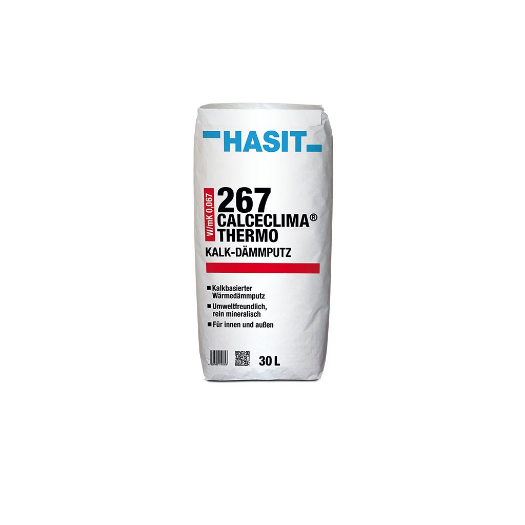HASIT 267 CalceClima® Thermo mit mineralischen Leichtzuschlägen bietet sich als ökologischer Kalk-Wärmedämmputz im Innen- und Außenbereich an. Entspricht einem Wärmedämmputzmörtel nach der technischen Spezifikation des Verbandes für Dämmsysteme, Putz und Mörtel e.V. (VDPM).• Wärmeleitfähigkeit λD: 0,067 W/(mK)