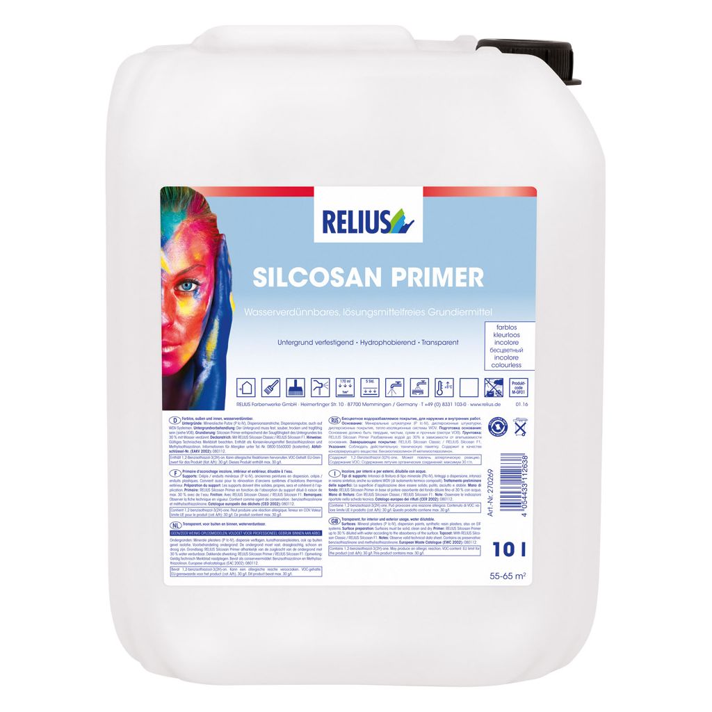 Wasserverdünnbares, lösemittelfreies, geruchsarmes Grundiermittel für außen und innen. RELIUS SILCOSAN PRIMER istleicht zu verarbeiten, schnell trocknend und alkalibeständig.