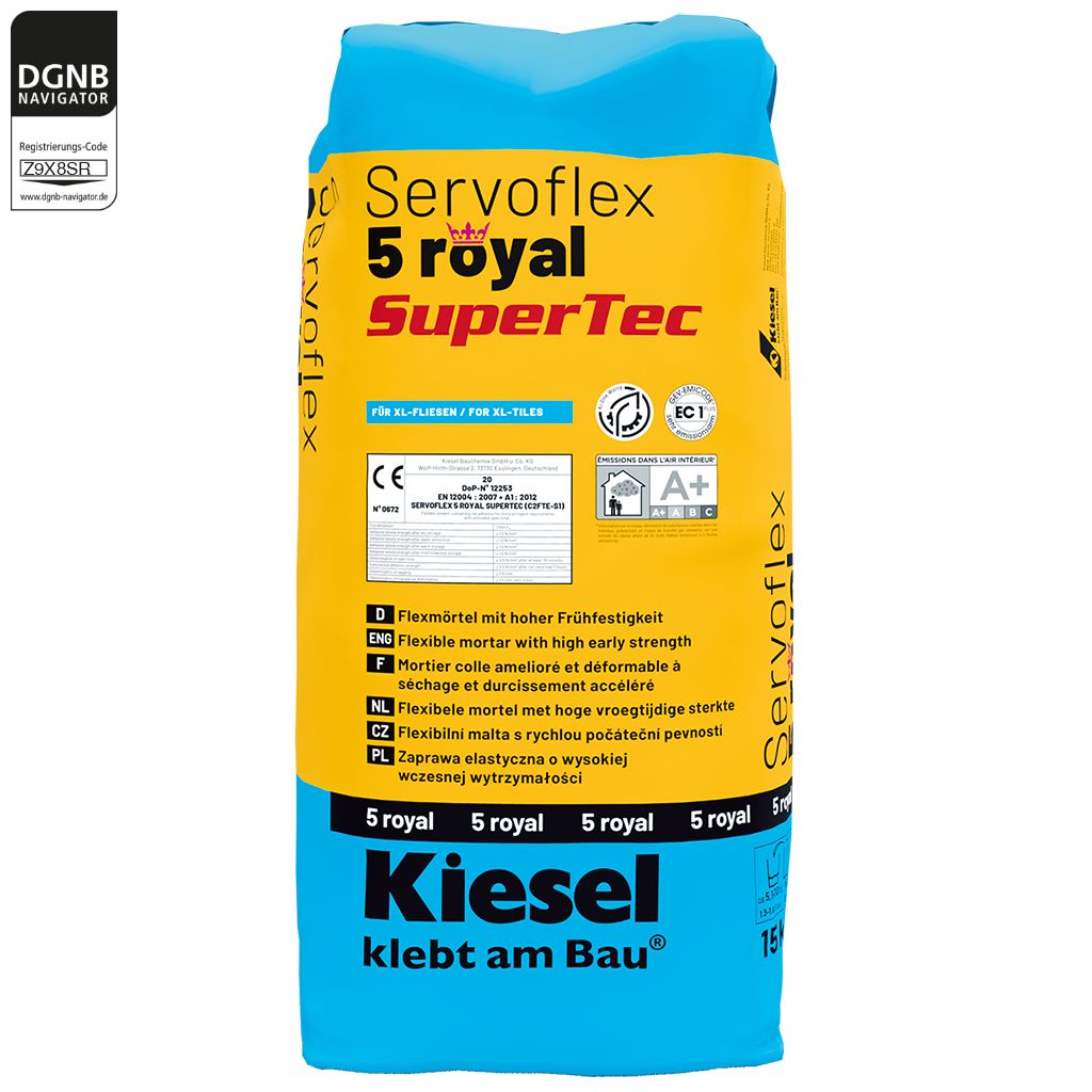 Standfester, hoch flexibler, zementärer Dünnbettmörtel zum Verlegen von keramischen Fliesen und Platten, Feinsteinzeug, Porzellanmosaik im Innen-, Außen- und Unterwasserbereich nach EN 12 004 C2TE-S1. Für Untergründe wie z. B. Ortbeton (mindestens 3…