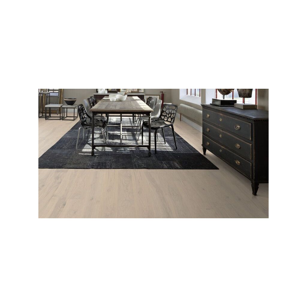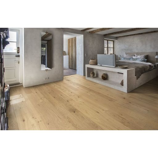 Dreischichtparkett mit 5G Klick-Verbindung mit einer edlen, massiven Nutzschicht aus hochwertigem Echtholz und einer stabilen Mittellage aus querverleimtem Holz. Diese Aufbauweise sorgt für hohe Formstabilität und macht das Parkett ideal für den…