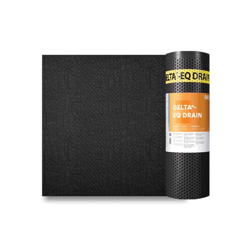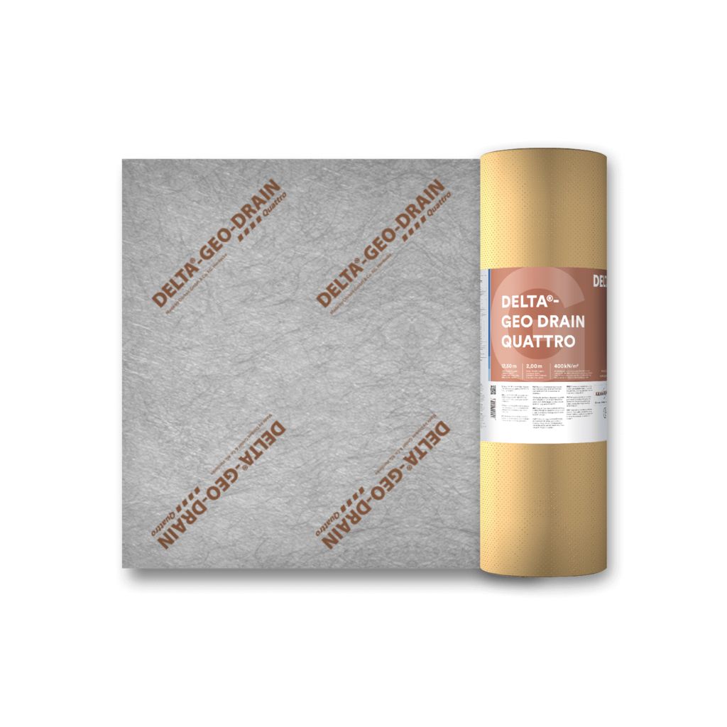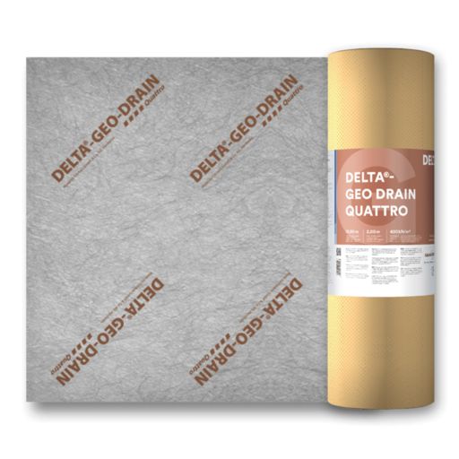 DELTA® - GEO DRAIN QUATTRO:Das einzigartige vierlagige Schutz- und Dränsystem für Einbautiefen bis 10 m. Mit integriertem Selbstkleberand.