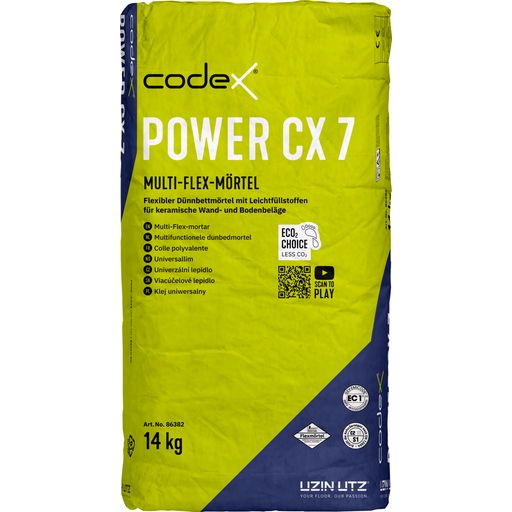 Der leichte Multi-Flexkleber codex Power CX 7 lässt sich ganz nach den Bedürfnissen des Fliesenlegers als Fließbett-, Dünnbett-, Mittelbettmörtel oder zum Spachteln einstellen und deckt damit 90 % aller Fliesenverlege-Arbeiten ab. Dank Leichtfüllstoffen ist der CX 7 nicht nur ergiebig sondern auch besonders leicht.PRODUKTVORTEILE / EIGENSCHAFTEN