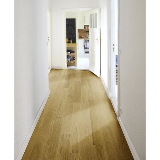 Zweischichtparkett aus einer edlen, massiven Nutzschicht aus hochwertigem Echtholz und einer stabilen Trägerschicht aus querverleimtem Holz. Diese Aufbauweise sorgt für hohe Formstabilität und macht das Parkett ideal für den Einsatz auf…