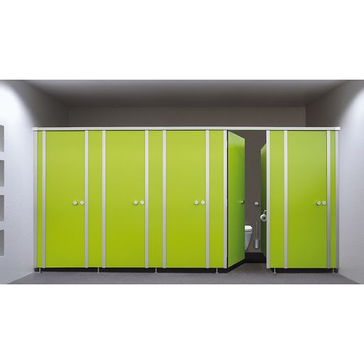 Die WC-Kabine BASIC Typ D ist die preiswerte und funktionale Lösung für alle Trockenräume. WC-Trennwände und Türen sind aus 30 mm starken Vollspan-