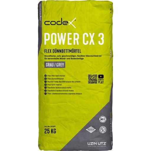 Der flexible Dünnbettmörtel codex Power CX 3 ist universell einsetzbar und für alle keramische Wand- und Bodenbeläge geeignet.Dank seiner Kunststoffvergütung erfüllt er die Anforderung C2 TE S1 nach EN 12 004 und ist für Mörtelbettdicken bis 10 mm geeignet.