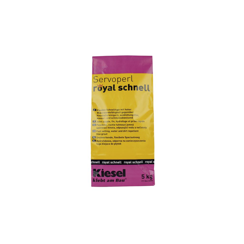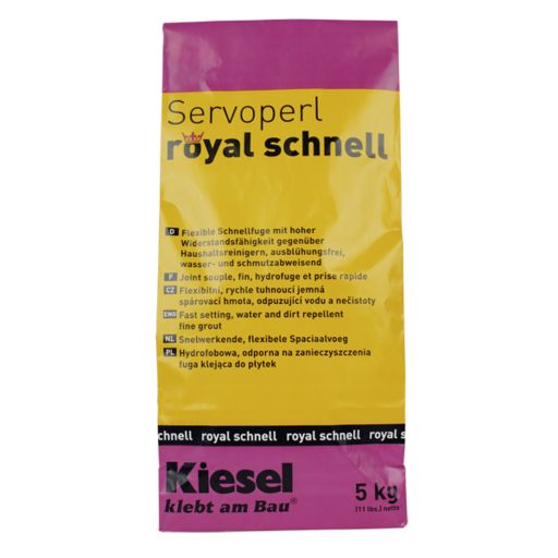 Die Belagsoberfläche auf Eignung prüfen und die Vorschriften der Belagshersteller beachten. Für ein einheit-liches Fugenfarbbild nur chargengleiches Material verwenden. Bevor mit der Verfugung begonnen wird, müssen der Verlegemörtel weitgehend abgebunden und trocken, die Fugen sauber und gleichmäßig tief sein.Servoperl royal schnell mit sauberem Wasser klumpenfrei zu einer pastösen Fugenmasse in einem einheitli-chen Farbton anrühren. Fugen erst quer und dann diagonal einschlämmen und vollständig füllen. Gleich nach Beginn des Antrocknens mit der Schwammscheibe mit möglichst wenig Wasser abwaschen.