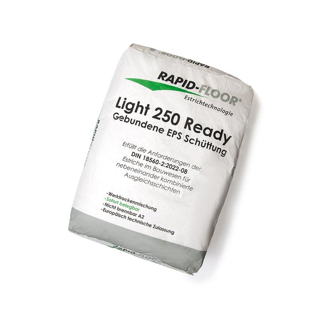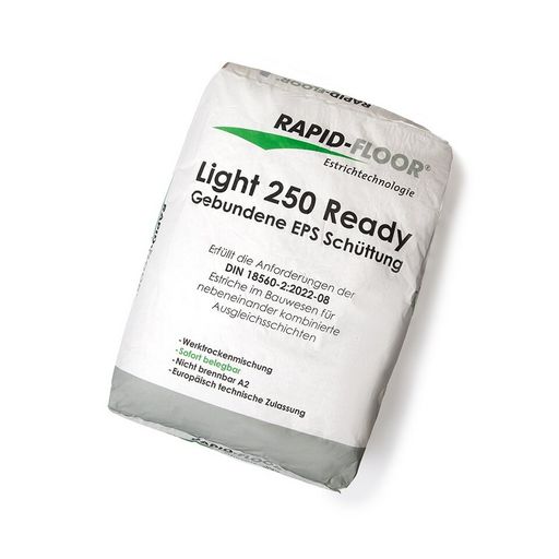 RAPID-FLOOR® Light 250 Ready ist eine Fertigmischung zur Herstellung einer zementgebundenen EPS-Schüttung mit Europäisch Technischer Zulassung (ETA-20/0173). RAPID-FLOOR® Light 250 Ready ermöglicht ein normgerechtes Verfüllen der Installationsebene und ist für Einbauhöhen ab mindestens 15 mm geeignet. Nach dem Verfüllen von Schlitzen, Kanälen etc. mit RAPID-FLOOR® Light 250 Ready kann die Oberfläche sofort belegt bzw. weiterbearbeitet werden. Bei einer vollflächigen Verlegung ist die Ausgleichsschicht nach 24 Stunden belegreif. Die Abfüllung erfolgt in einem Papiersack mit Folieneinlage (50 Liter).Produkteigenschaften und Vorteile auf einen Blick: