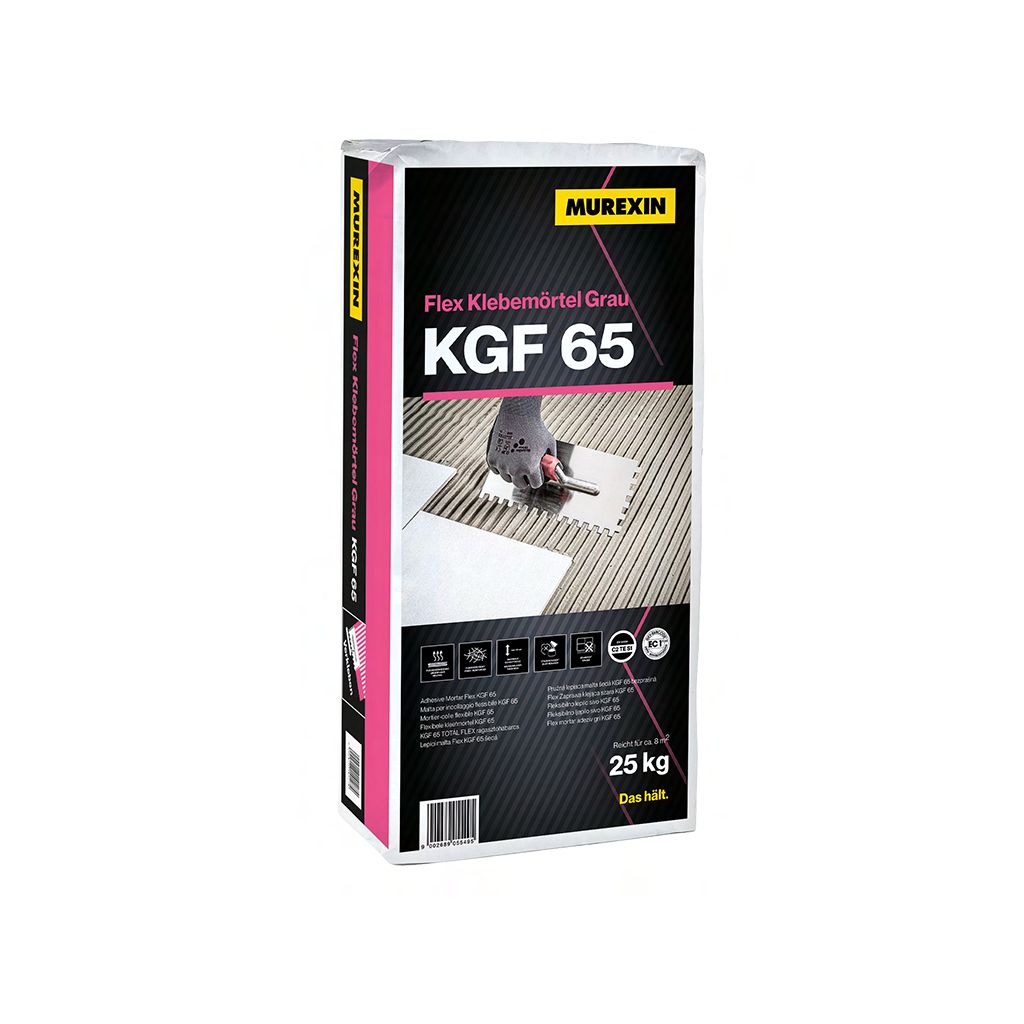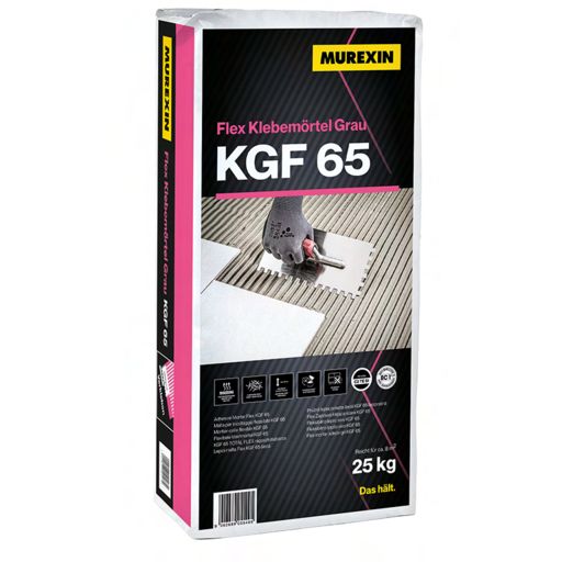 Flex Klebemörtel Grau KGF 65 ist ein pulverförmiger, faserverstärkter und staubreduzierter, wasser- und frostfester, hoch vergüteter, hydraulisch abbindender flexibler Klebemörtel mit verbesserter Durchhärtung für die Dünnbettverlegung bis 10 mm Schichtstärke. Im Innen- und Außenbereich zur Verlegung von keramischen Fliesen und Platten aus Steingut, Steinzeug und mittel bis großformatigem Feinsteinzeug sowie dunklen unempfindlichen Natursteinplatten. Geeignet für erhöhte thermische oder statische Belastung. Besonders gut geeignet für die Verlegung von Fliese auf Fliese. Systemklebemörtel gemäß abP für die Verbundabdichtungen WD-1K, PU 500, 2 KS, PSM 1K, 1 KS, AE 100, Uniplatte.Instructions for use