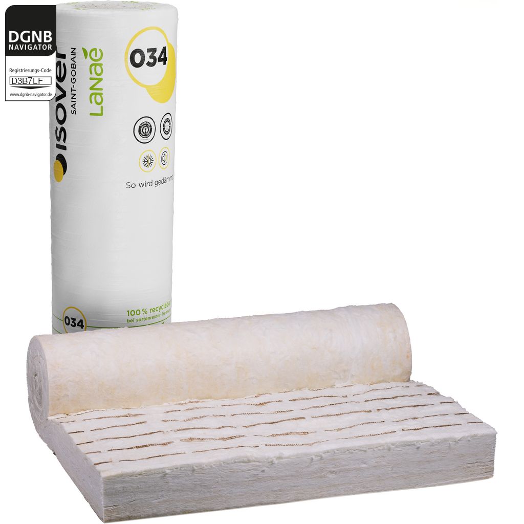 Lanaé Mineralwolle, gebunden mit einem in weitesten Teilen natürlichen Bindemittel, basierend auf Stoffen aus der Zucker- und Getreideproduktion, und hergestellt nach dem Glaswolle-Produktionsverfahren von SAINT-GOBAIN ISOVER, mit RAL-Gütezeichen der Gütegemeinschaft Mineralwolle e. V. und EUCEB-Zertifikat, freigezeichnet nach Gefahrstoffverordnung, Chemikalienverbotsverordnung und Verordnung (EG) Nr. 1272/2008 Anmerkung Q.