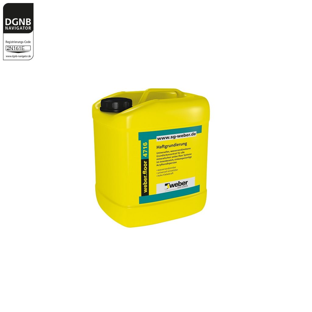 Mit weber.floor 4716 Haftgrundierung können nahezu alle Neu- und Altuntergründe im Wohnungs-, Gewerbe- und Industriebau grundiert werden. weber.floor 4716 Haftgrundierung ist universeller Systembestandteil der mineralischen Dünnestriche, Fließspachtel und Ausgleichsmassen, steuert das Saugverhalten des Untergrundes und stellt einen optimalen Haftverbund sicher.Contact the manufacturer