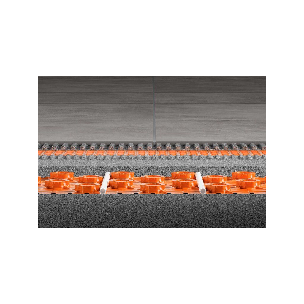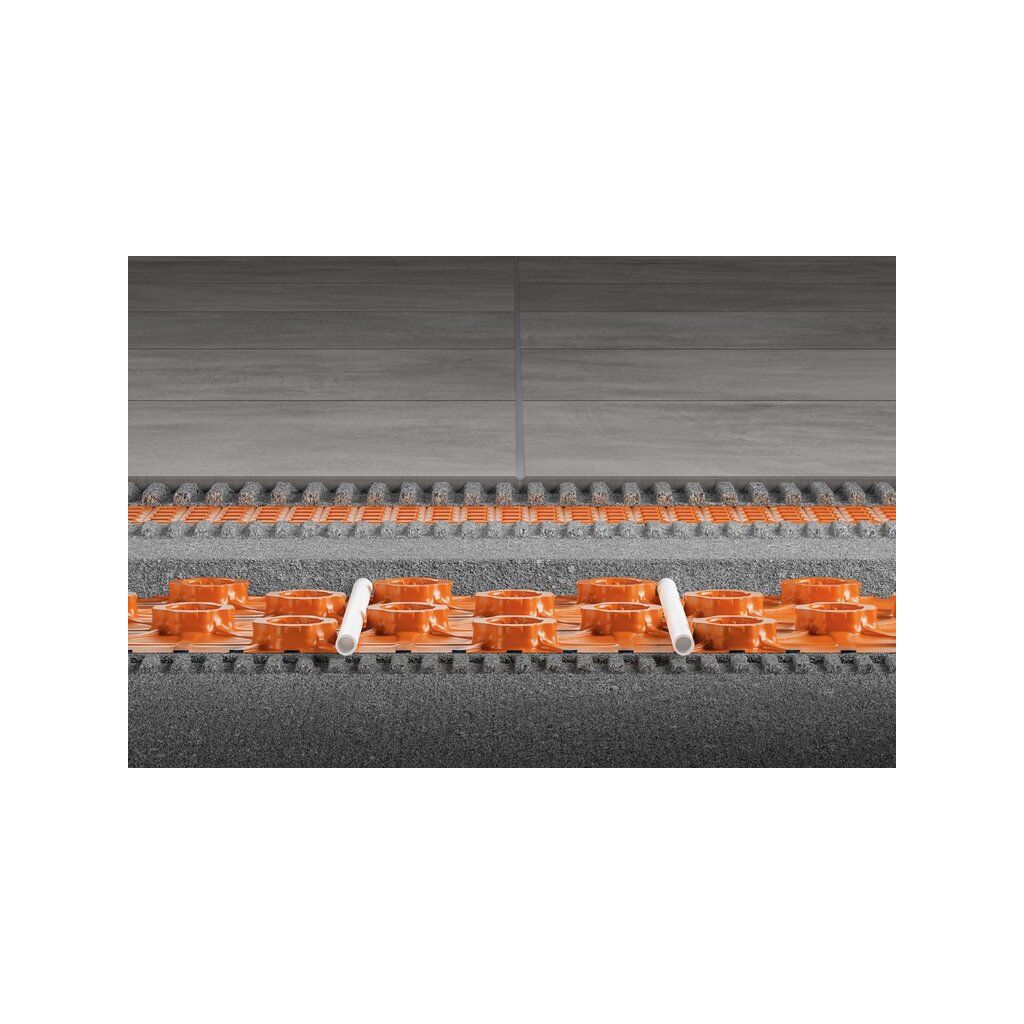 Die Ausgleichsplatte Schlüter-BEKOTEC-ENFGTS wird vor Heizkreisverteilern eingesetzt, um die Montage der Heizrohre im Verteilerschrank zu erleichtern. Mit dem mitgelieferten doppelseitigen Klebeband (6 m) wird die Platte aus Polystyrol an der Noppenplatte befestigt. Damit die Heizrohre sicher im System bleiben, ist unter der Ausgleichsplatte die gleiche Trittschalldämmung angebracht wie bei der EN 18 FTS.(Produktdatenblatt 9.4)