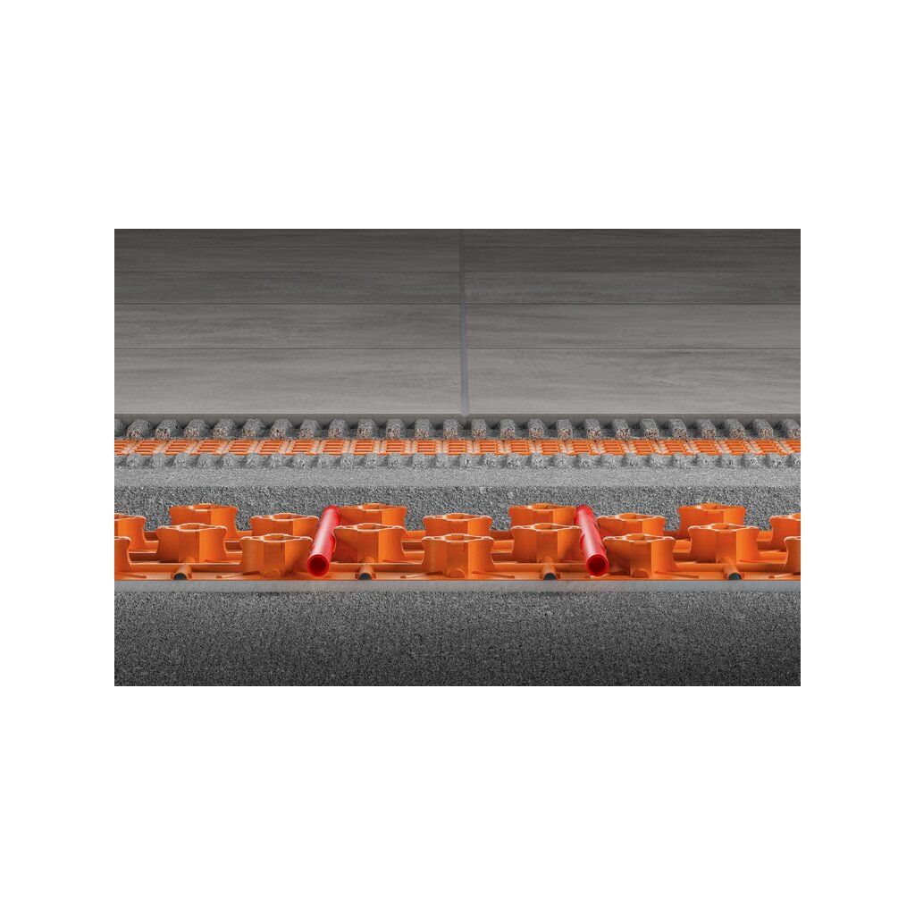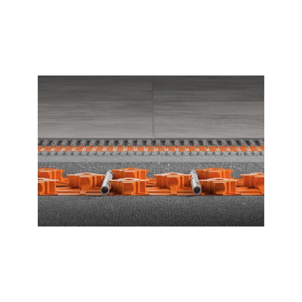 Schlüter-BEKOTEC ist die sichere Belagskonstruktionstechnik als System für rissfreie, funktionssichere und schwimmende Estriche und Heizestriche mit Belägen aus Keramik, Naturstein sowie andere Belagsmaterialien.Schlüter-BEKOTEC-EN-F ist eine Estrichnoppenplatte aus druckstabiler Polystyrol-Tiefziehfolie zur Aufnahme der Schlüter-Heizrohre (Ø 14 mm). Die BEKOTEC-Platten werden zur Verbindung um eine Noppenreihe überlappt und ineinandergesteckt. Die hinterschnittenen Noppen halten das Rohr in einem definierten Abstand (Raster 75 mm). Mit der Einhaltung einer Mindestüberdeckung von 8 mm (max. 25 mm), der Verwendung eines handelsüblichen Estrichs auf Zement- oder Calciumsulfatbasis (Druckfestigkeit C20– C35 / Biegezugfestigkeit F4 max. F5) und der BEKOTEC-THERM-HR-Heizrohre stellen Sie sicher, dass keramische und Natursteinbeläge im System dauerhaft rissfrei bleiben. Überdeckungen und Ausführungen für alternative Beläge entnehmen Sie bitte unserem Technischen Handbuch.
