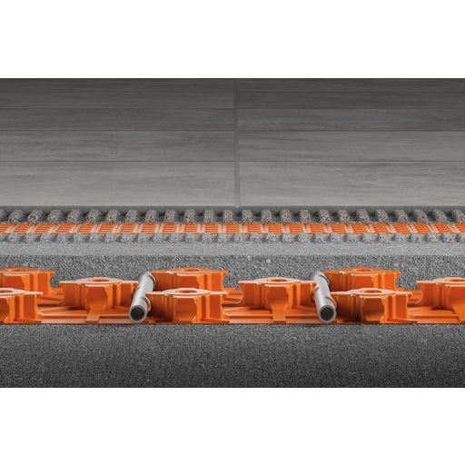 Schlüter-BEKOTEC-EN-FTS ist eine Estrichnoppenplatte aus druckstabiler Polystyrol-Tiefziehfolie, die rückseitig mit einer 5 mm Trittschalldämmung versehen ist. Die hinterschnittenen Noppen halten das Rohr in einem definierten Abstand (Raster 50 mm). Die BEKOTEC-Platten werden zur Verbindung um eine Noppenreihe überlappt und ineinandergesteckt. Mit der Einhaltung einer Mindestüberdeckung von 8 mm (max. 20 mm), der Verwendung eines handelsüblichen Estrichs auf Zement- oder Calciumsulfatbasis (Druckfestigkeit C20–C35 / Biegezugfestigkeit F4 max. F5) und der BEKOTEC-THERM-HR-Heizrohre stellen Sie sicher, dass keramische und Natursteinbeläge im System dauerhaft rissfrei bleiben. Überdeckungen und Ausführungen für alternative Beläge entnehmen Sie bitte unserem Technischen Handbuch.