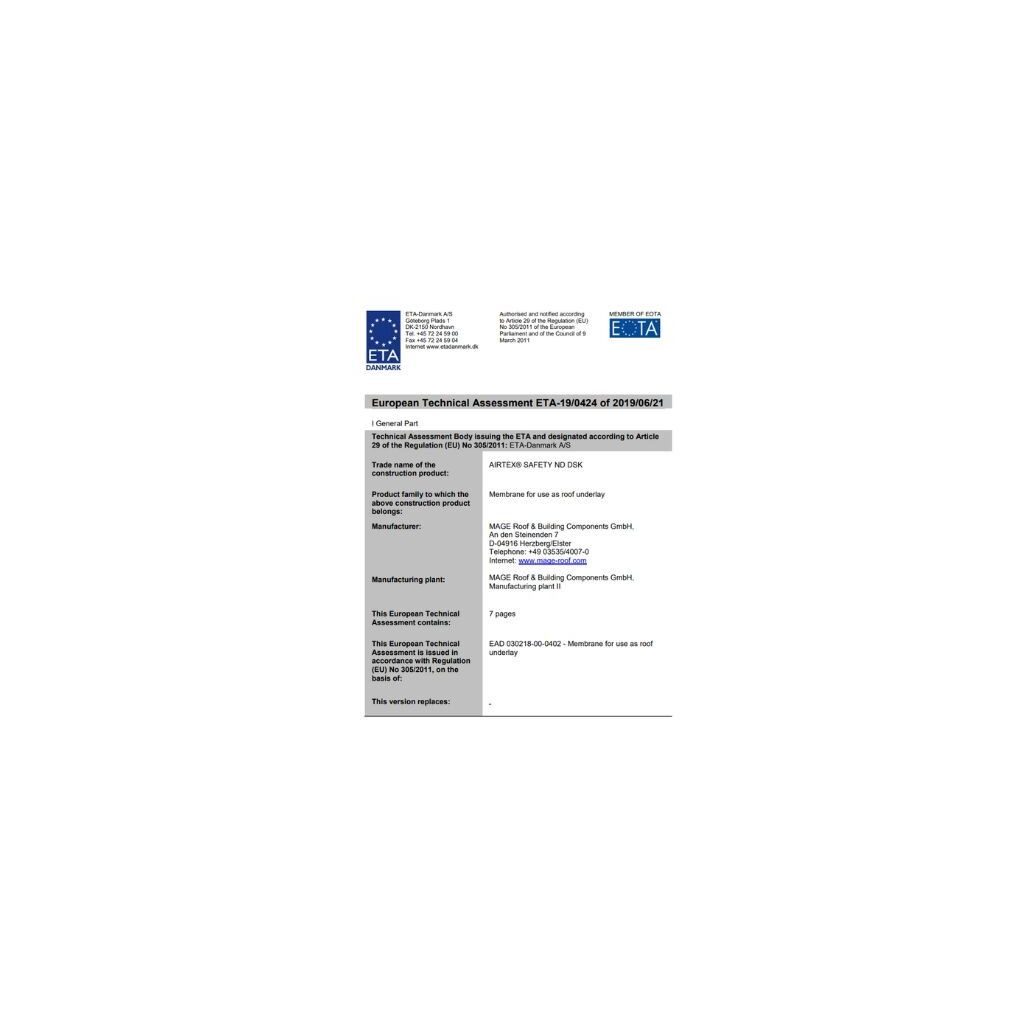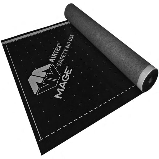 Hoch diffusionsoffene Unterdeck- und Unterspannbahn aus PET-Vlies mit TPU-Beschichtung und doppeltem Selbstklebestreifen. Die UDB/USB eignet sich für die Verlegung auf allen vollgedämmten, ungeschalten und geschalten Steildächern sowie für die Verlegung unter einer Schiefereindeckung.Die AirTex® Safety ND DSK ist ETA-geprüft und verfügt über eine nachgewiesene Perforationssicherheit, die eine Verlegung ohne Nageldichtband bis zu einer Dachneigung von 14° in Abhängigkeit von der Regeldachneigung des Bedachungsmaterials nach den Fachregeln des ZVDH ermöglicht.