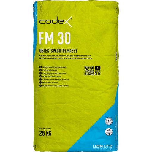 Die Objektspachtelmasse codex FM 30 ist eine selbstverlaufende Zement-Bodenausgleichsmasse für Schichtdicke von 3-30 mm. Dank schneller Trocknung wird eine verkürzte Wartezeit erreicht. Schichtdickenbereich von 3 - 30 mm, Sehr guter Verlauf, Schnell erhärtendHohe Ergiebigkeit, dadurch kostengünstig, Spannungsarm, Früh belegreif - dadurch zeitsparend, Universell einsetzbar, Gute Einbettung bei dünnschichtigen Fußbodenheizungen, Beste Verarbeitungseigenschaften, Ausgezeichnet fließ- und pumpfähig, Hohe Druck- und Biegezugfestigkeit, Erfüllt Anforderungen C25 F5 nach EN 13813, Brandverhalten A1-fl, Für wohngesundes Bauen.