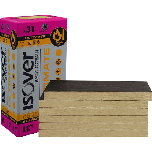 ULTIMATE Fassaden-Dämmplatten - die bessere Steinwolle kombiniert die Produktvorteile von Steinwolle und Glaswolle optimal: bester Brandschutz und hohe Energieeffizienz!Die ULTIMATE FSP-034 (035) Fassaden-Dämmplatte mit Lambda Bemessungswert 035 erfüllt höchste Ansprüche an eine moderne, vorgehängte hinterlüftete Fassadendämmung. Hoher Wärmedämmwert in sehr guter Wärmeleitstufe 035 für Mineralwolle, Witterungsbeständigkeit dank Hydrophobierung und schwarzer Vlieskaschierung, hohe Schallschutzfunktion und bester Brandschutz mit Nichtbrennbarkeit.