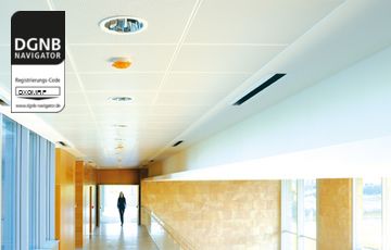 Abgehängte, akustisch wirksame Decke mit Baffeln. Baffeln und Unterkonstruktion bestehen aus verzinktem Stahlblech mit beschichteter Sichtseite und mit oder ohne Akustikvlies/Füllung/thermischer Aktivierung.Documents