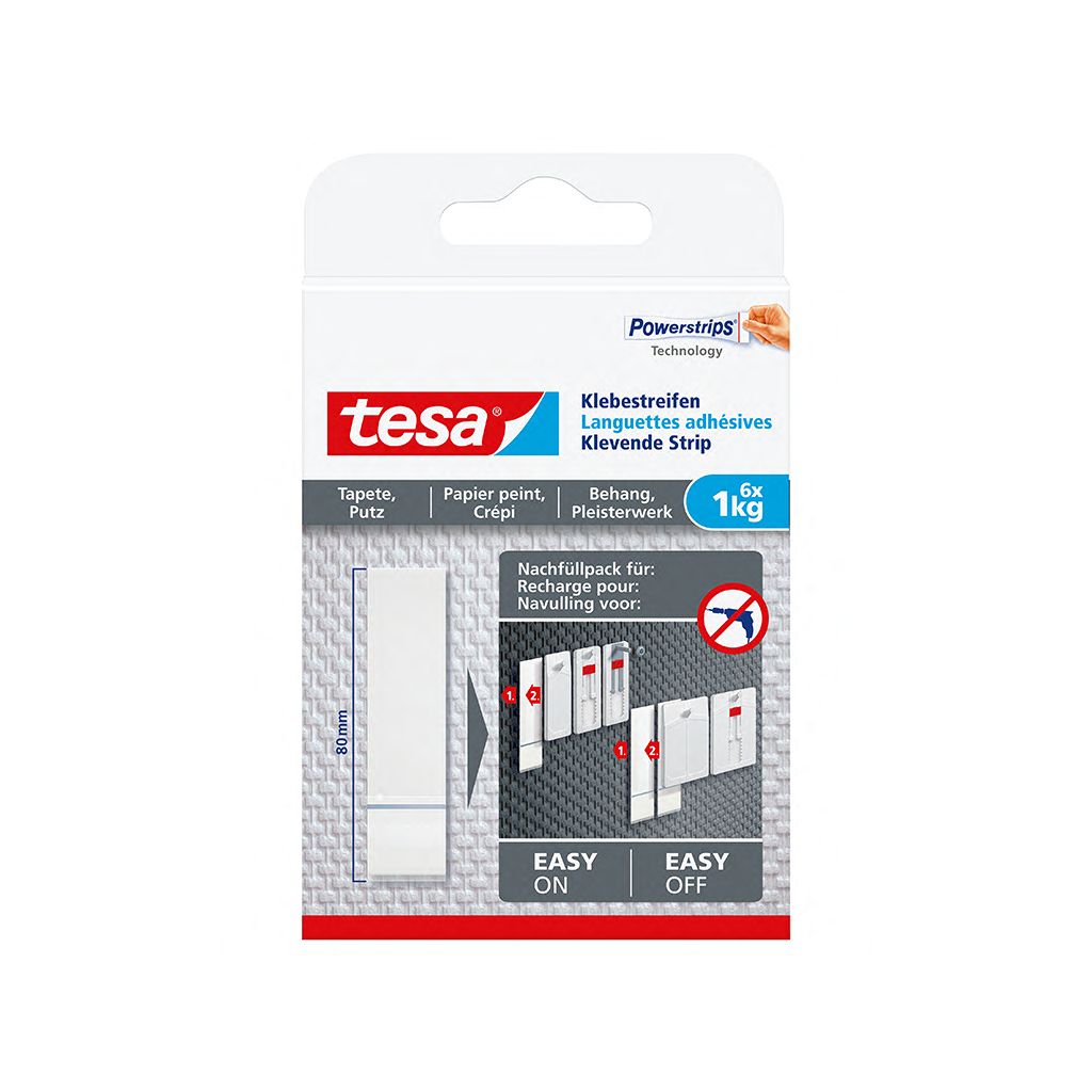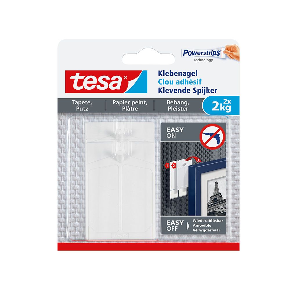 Der innovative Klebenagel von tesa® hält auf empfindlichen Untergründen wie Tapeten oder Putz. Es gibt verschiedene Ausführungen von Halteleistungen, dadurch lassen sich Objekte bis zu 2kg (mit zwei großen Nägeln 4kg) sicher aufhängen. Um Objekte optimal gerade auszurichten empfehlen sich die verstellbaren Klebenägel. Für die Nutzung des Klebenagels als Alternative zu "normalen" Nägeln oder Schrauben sprechen viele Gründe. Man benötigt kein Werkzeug, hinterlässt keine Spuren und vermeidet Beschädigungen am Untergrund. Außerdem lässt sich der Klebenagel mit einem passenden Klebestreifen einfach wiederverwenden. Hinweis: Die Haltekraft hängt von der Festigkeit des Untergrunds ab. Wenn Sie eine Leinwand bzw. Keilrahmen auf Tapeten oder Putz im Innenbereich befestigen möchten, gibt es ebenfalls eine clevere Lösung: Den innovativen tesa® Klebennagel für Leinwände! Sie müssen nicht hämmern oder bohren, sondern kleben den Nagel einfach an die Wand. Die tesa Powerstrips® Technologie sorgt für eine Halteleistung von bis zu 1kg (pro Klebenagel). Eine Metallspitze sichert die Leinwand zusätzlich. Da der Nagelkopf verstellbar ist, können Sie das aufgehängte Objekt jederzeit optimal ausrichten und die Höheneinstellung korrigieren. Der Klebenagel ist spurlos ablösbar und kann wiederverwendet werden.Documents