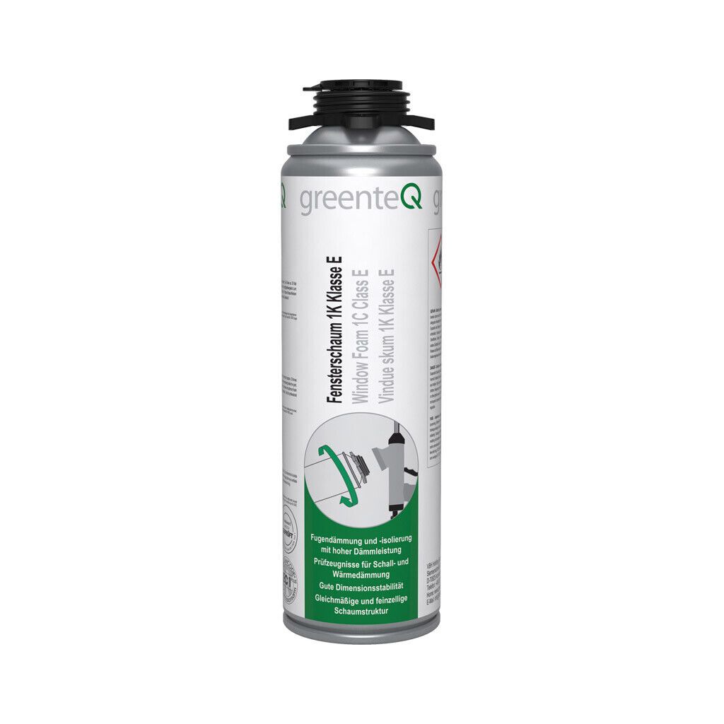 Der Fensterschaum für die Schall- und Wärmedämmung bei der Fenstermontage.Der greenteQ Fensterschaum 1K ist ein gebrauchsfertiger, feuchtigkeitshärtender, einkomponentiger, selbstexpandierender Polyurethanschaum, der über eine hervorragende Formstabilität verfügt. Der greenteQ Fensterschaum 1K ist zum Füllen, Dämmen, Kleben, Dichten und Isolieren geeignet und haftet ausgezeichnet auf fast allen Bauuntergründen. Sehr gute Dämm- und Isoliereigenschaften des Schaums gewährleisten eine höhere Schall- und Wärmedämmung, als sie durch die Verwendung von Mineralwolle, Kork und Fiberglas erreicht werden kann.