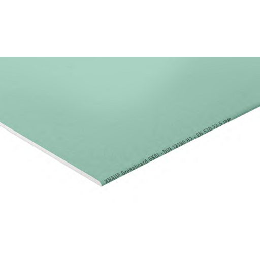 Das Knauf Greenboard ist speziell für den Einsatz in Feuchträumen wie Bäder und Küchen konzipiert. Die Oberflächen sind imprägniert, um die Gipskartonplatte vor Feuchtigkeit zu schützen. Clever: imprägnierte Gipsplatten von Knauf sind immer grün eingefärbt – so kann es nicht zu Verwechslungen auf der Baustelle kommen. Knauf Greenboards wiegen ca. 11,16 kg, so sind sie für eine Person leicht zu transportieren und beim Einbauen gut zu handhaben. Weitere Pluspunkte: Die Platten sind äußerst stabil, nicht brennbar und frei von gesundheitsschädlichen Stoffen.Knauf Bauplatte GKBI ist eine imprägnierte und großformatige Gipskartonplatte, die Sie für viele Trockenbauprojekte in häuslichen Feuchträumen wie Küche oder Bad verwenden können, insbesondere bei großen Flächen. Aufgrund ihrer Imprägnierung ist sie feuchtigkeitsabweisend und daher vor Spritzwasser und erhöhter Luftfeuchtigkeit bestens geschützt. Wie alle imprägnierten Gipsplatten von Knauf ist sie grün eingefärbt – dies verhindert, dass es auf der Baustelle zur Verwechslung kommt. Da die Platte außerdem belastbar und formbeständig ist, werden die Ergebnisse Ihrer Arbeit von Dauer sein.