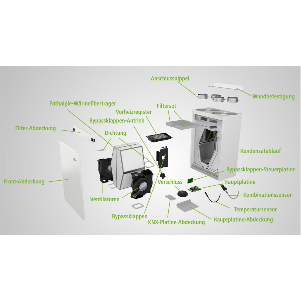 Kermi® x-well® C225 Wohnraumlüftungsgerät mit Wärmerückgewinnung und Kanalanschlüssen.Zur Be- und Entlüftung von Wohnungen und Wohnhäuser bis ca. 160 m² Wohnfläche.