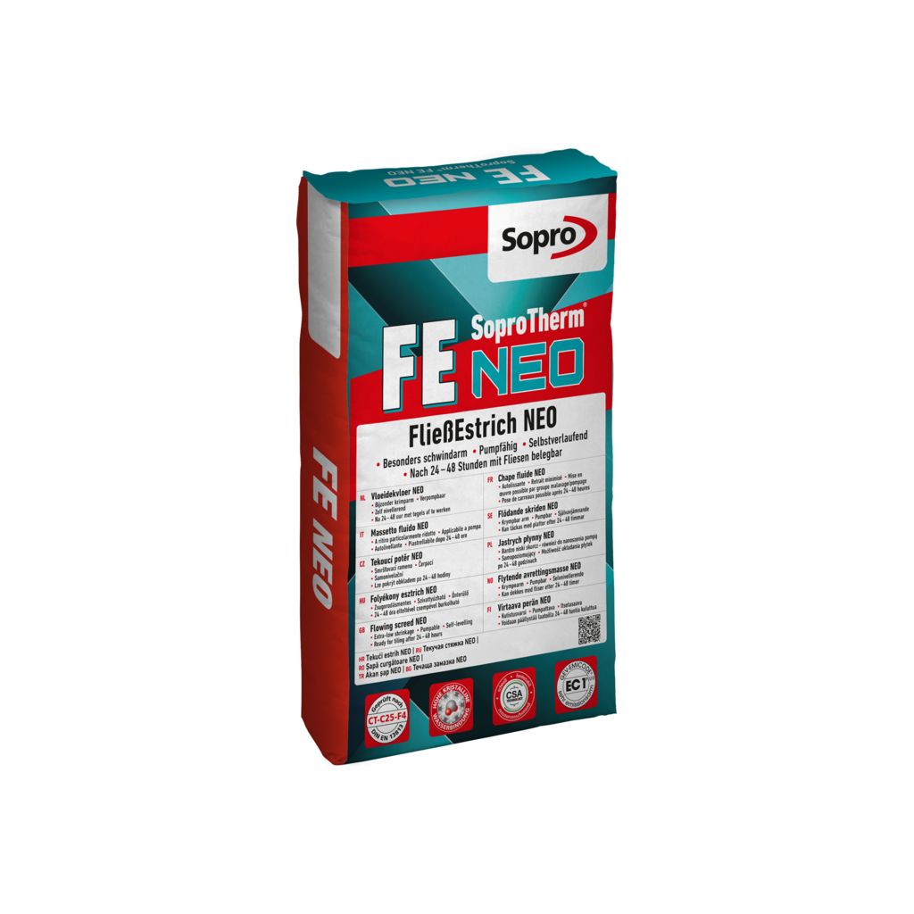 SoproTherm®FE NeoTrockenfertigmischung zur Herstellung besonders schwindarmer und früh belegereifer Zementfließestriche. Güteklasse CT-C25-F4 nach DIN EN 13813. Geeignet für beheizte und unbeheizte Estriche im Verbund, auf Trenn- oder Dämmschicht. Für die nachfolgende Verlegung von Bodenbelagsbaustoffen aller Art. Auch als direkt nutzbare Oberfläche einsetzbar. Insbesondere für zeitsparende bzw. termingebundene Estricharbeiten.