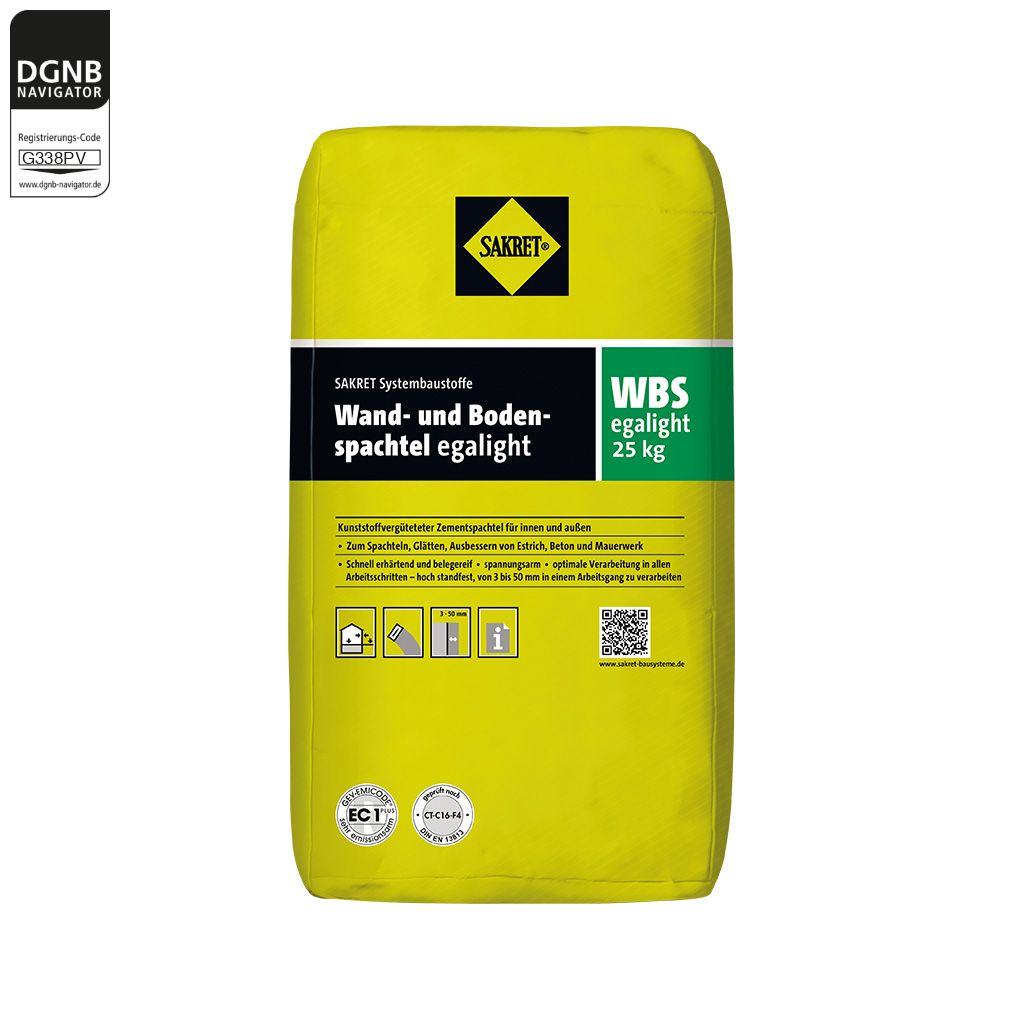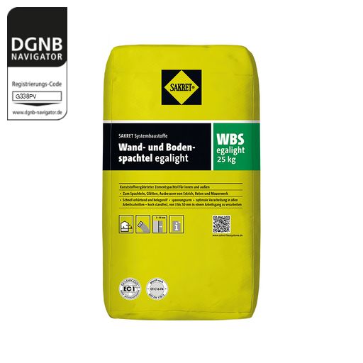 SAKRET Wand- und Bodenspachtel WBS egalight ist ein standfester, kunststoffmodifizierter, leicht verarbeitbarer Werktrockenmörtel mit CT-C16-F4 gemäß DIN EN 13813.Er ist geeignet zum Abspachteln, Glätten und Ausbessern von Estrichen, Kalk- Zement- Putzen (PII), Zement- Putzen