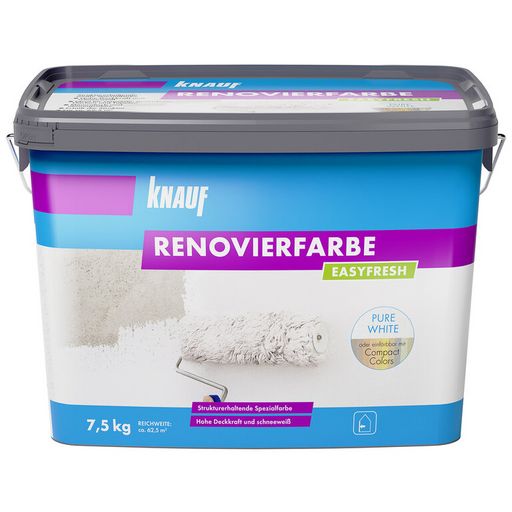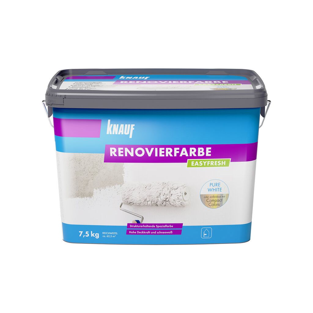 Knauf EASYFRESH ist eine mineralische, strukturerhaltende Renovierfarbe, die Sie universell in Ihren Wohnbereichen einsetzen können. Die weiße Spezialfarbe eignet sich hervorragend zum Streichen von strukturierten und glatten Untergründen. Dazu gehören mineralische Putze (außer Lehmputze), Dekor-, Gips-, Kalk-, sowie Zementputze, sowie Gipsfaserplatten, Tapeten und Farbanstriche.Kontakt zum Hersteller