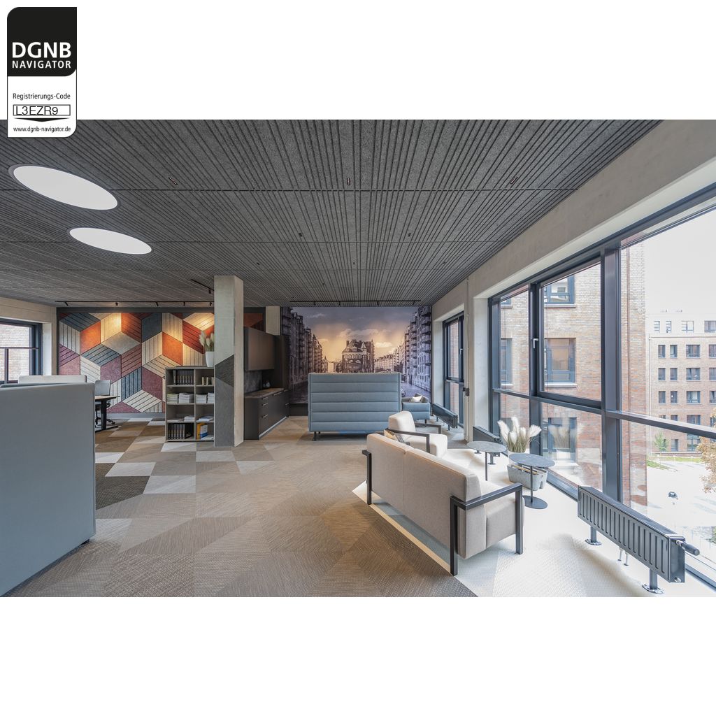 Montage: Troldtekt wird direkt auf Holzlattungen an Decken und Wänden oder in Profilsystemen als abgehängte Decken montiert. Zur Troldtekt-Serie gehören speziell entworfene Schrauben und Beschläge sowie Profilsysteme für abgehängte Decken, mit verdeckten oder sichtbaren Schienen.Bezug zum DGNB System
