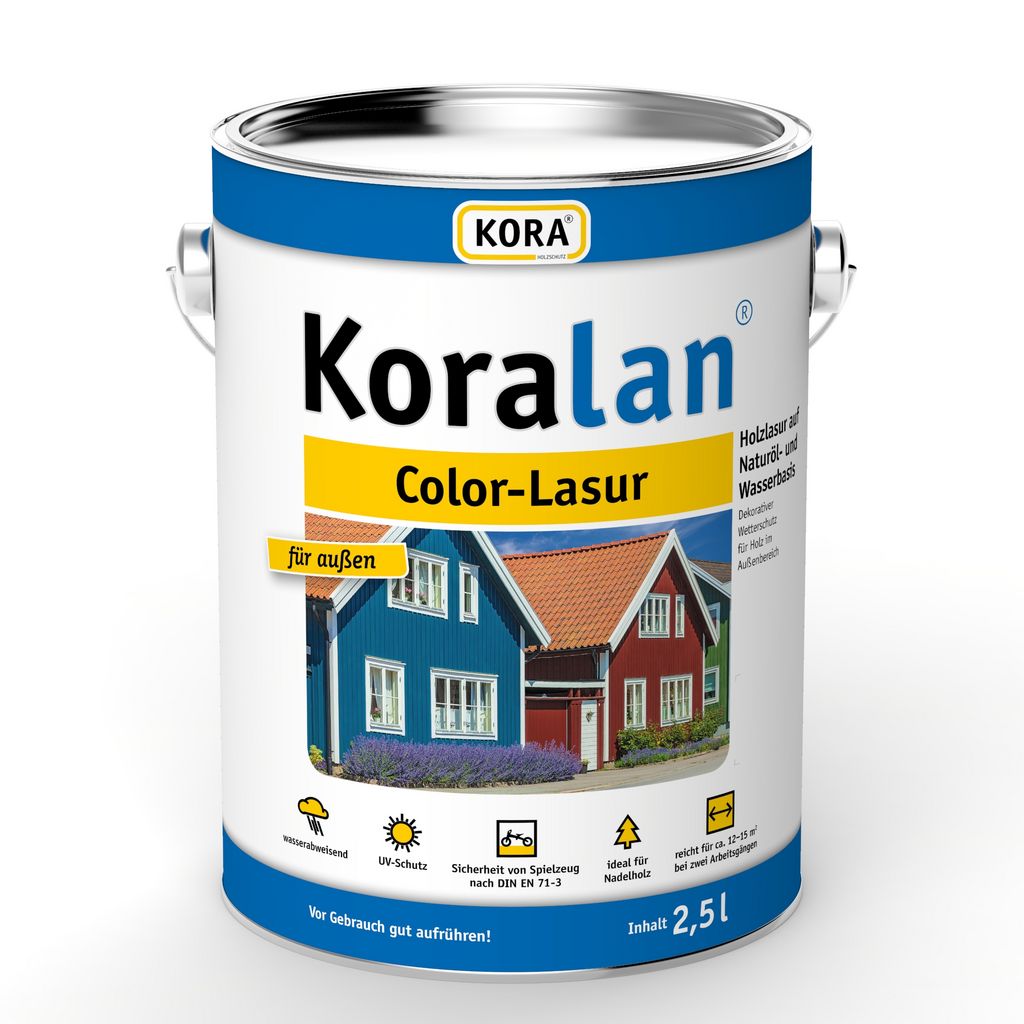 Koralan Color-Lasur ist feuchtigkeitsregulierend und schützt das Holz vor Witterungseinflüssen (Sonne, Regen) sowie vor Vergrauung.