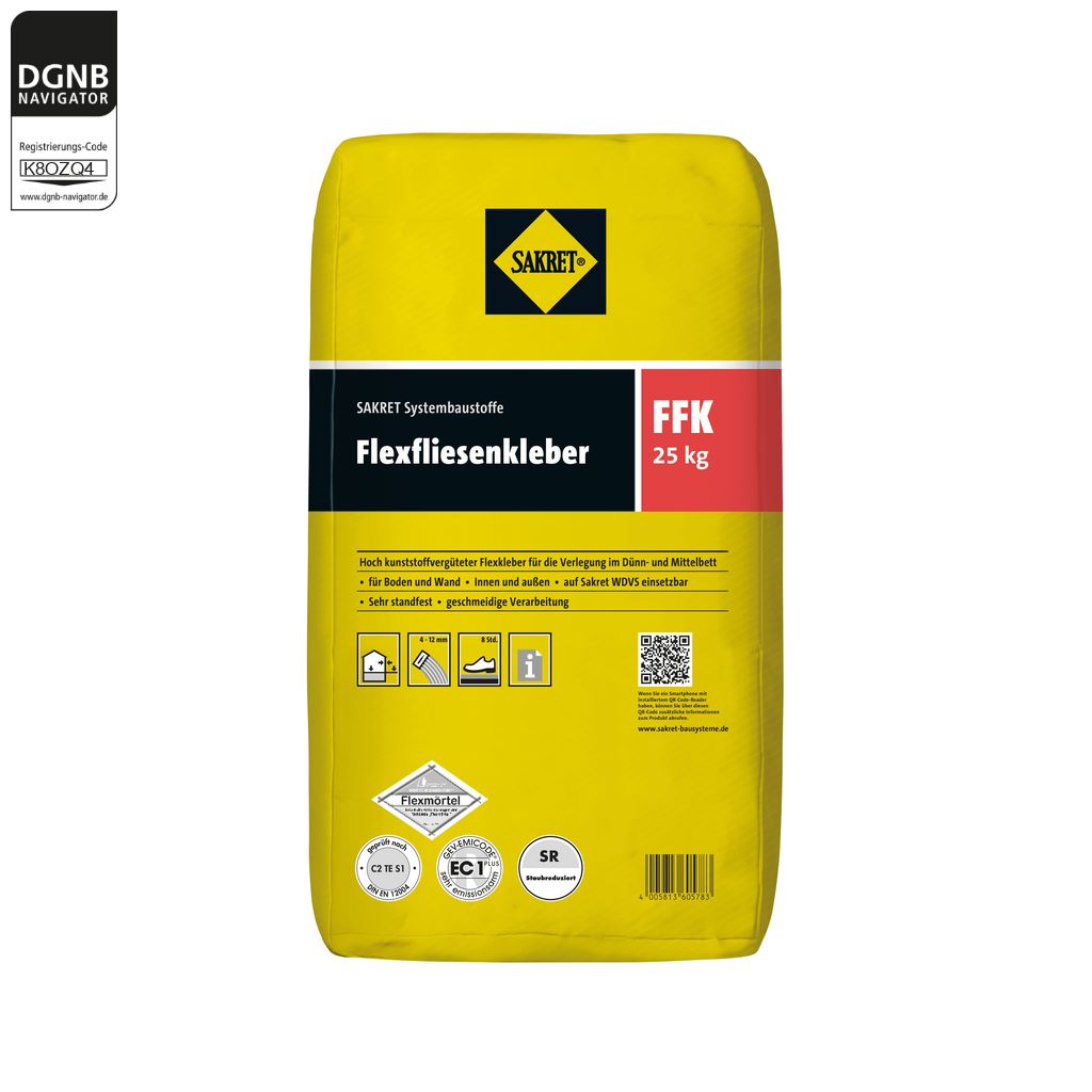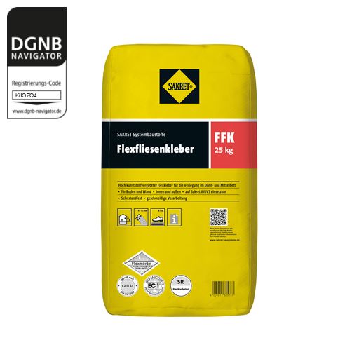 Flexfliesenkleber FFK ist staubreduziert, hoch vergütet, sehr standfest, hydraulisch abbindend, geschmeidig, daher gut abziehbar, flexibel, Haftfestigkeit gemäß DIN EN 1348 > 1,0 N/mm², erfüllt die Anforderungen der Richtlinie für Flexmörtel der deutschen Bauchemie e.V., für Heizestriche geeignet. SAKRET Flexfliesenkleber FFK erfüllt folgende Umwelt- und Nachhaltigkeitsstandards: EC 1 PLUS: emissionsgeprüftes Bauprodukt gemäß den Kriterien der GEV. AgBB: erfüllt die Anforderungen nach dem Bewertungsschema des Ausschusses zur gesundheitlichen Bewertung von BauproduktenEr ist geeignet für die Verlegung von: