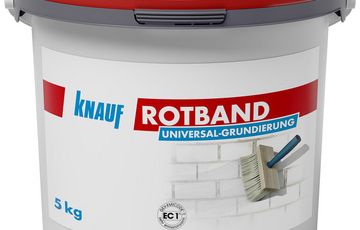 Knauf Rotband Universal-Grundierung verschließt die Poren von saugenden, mineralischen Untergründen und sorgt so dafür, dass dem Grundputz oder der Spachtelmasse (z. B. Knauf Rotband Haftputzgips, Knauf Rotband Flächenspachtel und Knauf Rotband…