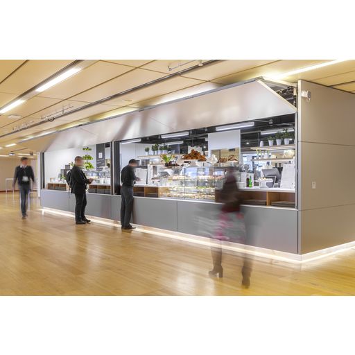 Horizontalfaltladen für den Einbau an Fassaden und innen als mobile Raumteiler.Verwendungshinweise