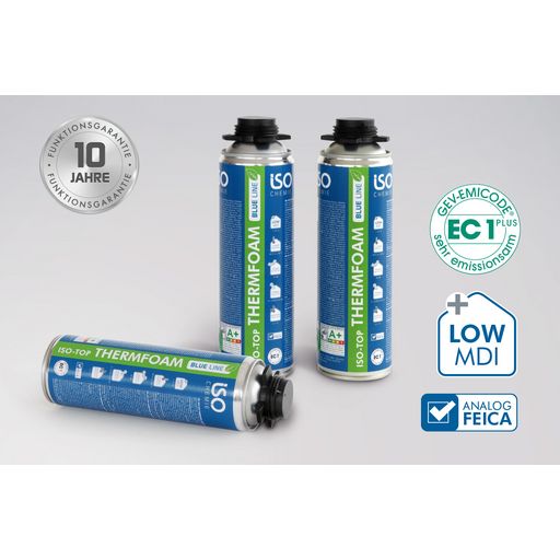 ISO-TOP THERMFOAM „BLUE LINE” ist ein nachhaltig anwenderfreundlicher, sehr emissionsarmer und wohngesunder 1KPolyurethan-Pistolenschaum mit hervorragenden technischen Eigenschaften. Es ist eine gesundheitsfreundlichere Alternative zu herkömmlichem PU-Schaum aufgrund monomerarmer Rezeptur, mit einem Gehalt an freien Isocyanaten von weniger als 0,1 %. Der Schaum eignet sich ideal zum Füllen und Dämmen von Fugen und Hohlräumen zur Wärme- und Schalldämmung durch hohe Formstabilität.Verwendungshinweise