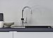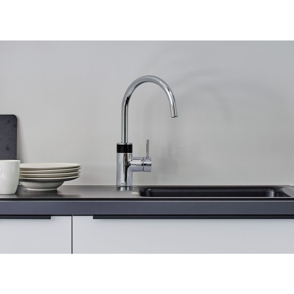 Sensorarmatur für die Küchenspüle mit seitlichem BedienhebelDie Infrarot-Sensorik (automatische Einstellung) mit funktionssicherem Magnetventil schaltet das Wasser berührungslos ein