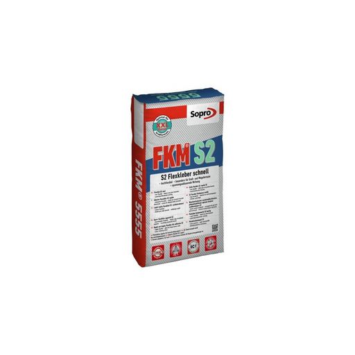Zementärer, emissionsarmer, einkomponentiger, hoch flexibler Dünnbettkleber, C2 FE S2 nach DIN EN 12004, für die besonders sichere Verlegung von Feinsteinzeug-, Beton- und Natursteinplatten. Geeignet für Groß- und Megaformate am Boden und mit Verlegehilfen auch an der Wand. Als Spezialkleber auf einer Vielzahl von verformungsfähigen Untergründen anwendbar. Sehr gute Verarbeitungseigenschaften durch sahnige und geschmeidige Verarbeitungskonsistenz. Geeignet auf Wand- und Fußbodenheizungen und Sopro Verbundabdichtungen sowie für schnelle Terminbaustellen.Innen, Wand (mit Verlegehilfen) und Boden