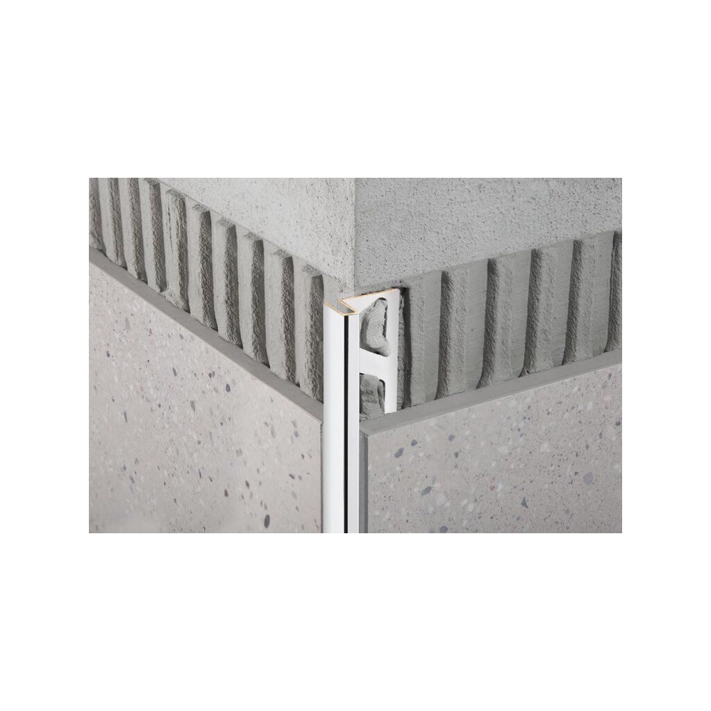 SCHIENE-MSchlüter-SCHIENE ist ein spezielles Profil zum Schutz und zur Dekoration der Außenkanten an Fliesenbelägen, lässt sich aber auch für andere Belagsmaterialien und Anwendungen sehr gut einsetzen. Weitere Anwendungsbereiche sind u. a. Übergänge verschiedener Belagsarten (z. B. Fliesen zu Teppichboden), Sockelabdeckungen, Kantenschutz an Dehnungsfugen, saubere und dekorative Abschlusskanten an Wandaußenecken und an Treppenstufen sowie Flächen- und Feldbegrenzungen jeglicher Art und saubere Begrenzungen für Belagsmaterialien wie Teppich, Parkett, Laminat, Natursteinbeläge oder Reaktionsharzbeschichtungen. Durch die besondere 87°-Winkelstellung des Profils sowie spezielle Materialdicken werden auftretende Lasten in den Belag und Untergrund abgeleitet. Der Kantenbereich des Belages wird so wirksam vor Beschädigungen geschützt. Die SCHIENE in allen Materialien kann mit einer Radiusstanzung „R“ versehen werden, dadurch wird das Biegen einer Rundung ermöglicht. (Produktdatenblatt 1.1)
