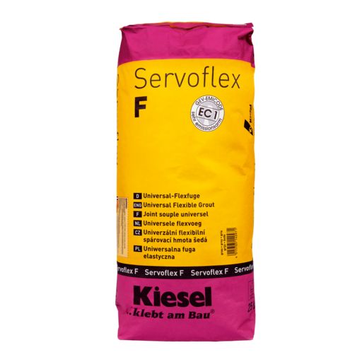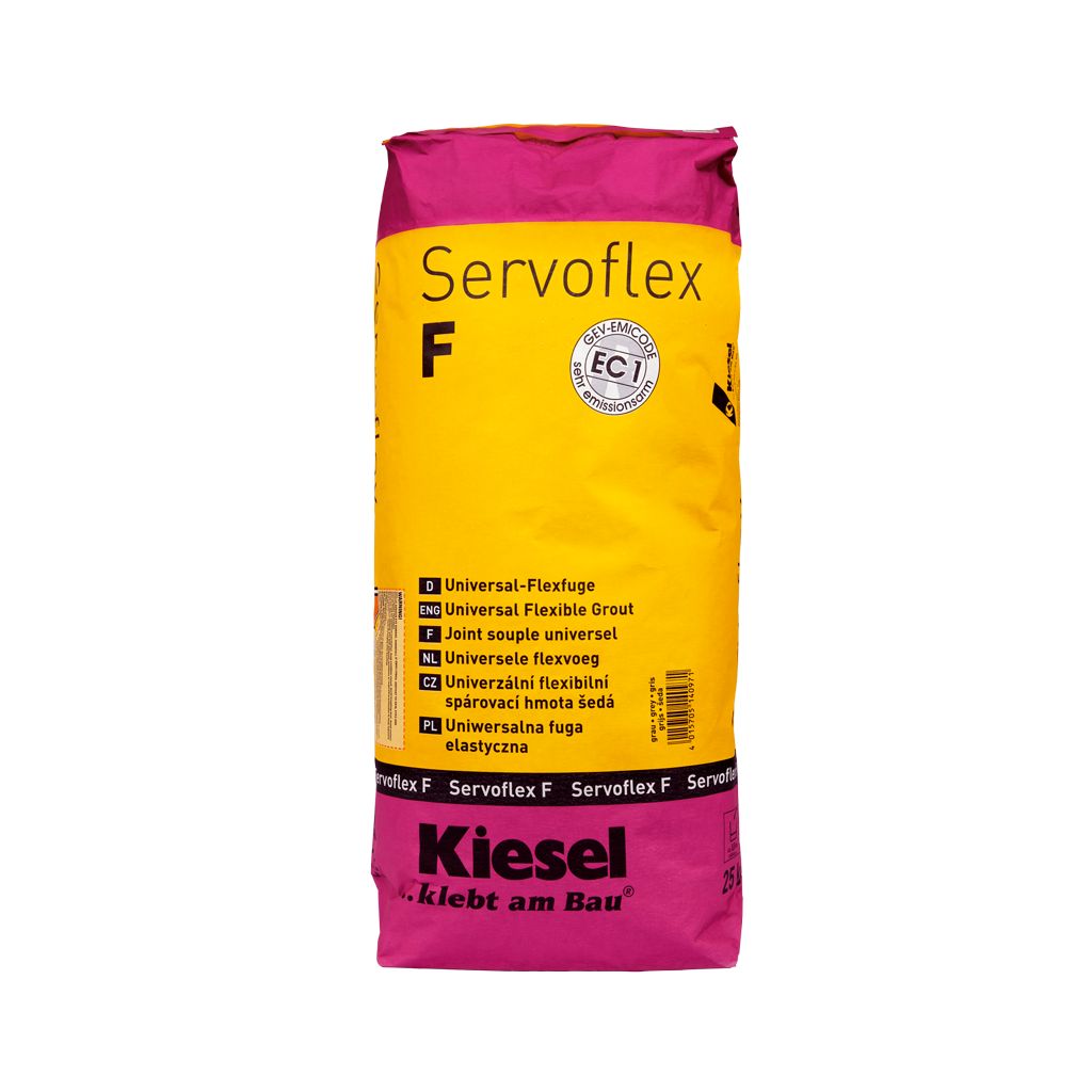 Schnell erhärtende, wasser- und schmutzabweisende zementäre Fugenmasse mit flexibel wirkenden Kunst-stoffanteilen für besondere Ansprüche wie hohe Abriebfestigkeit, hohe Verformbarkeit, sehr guten Span-nungsabbau und gute Flankenhaftung. Servoflex F ist geeignet zur Verfugung von keramischen Belägen auf formstabilen Untergründen (im Innen- und Außenbereich für Fugenbreiten von 3-25 mm), insbesondere Feinsteinzeug sowie geeigneten Naturwerksteinbelägen auf Balkonen und Terrassen, an Fassaden sowie auf Heizestrichen oder Zwischenwänden aus Gipskartonplatten und für Keramikbeläge auf Okaphone Dämmplatten. Durch die hervorragenden Verarbeitungseigenschaften und den günstigen Erhärtungsverlauf wird ein Auswaschen der Fugen verhindert. Servoflex F brennt nicht auf und bindet auch bei ungünstigen Temperaturen sicher ab. Servoflex F zeigt eine hohe Widerstandsfähigkeit gegen saure Reiniger und mechanische Belastungen.Verwendungshinweise
