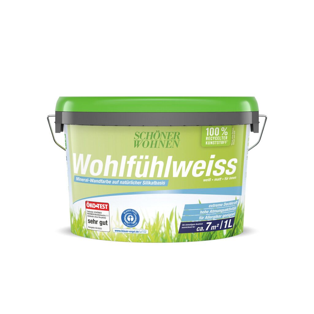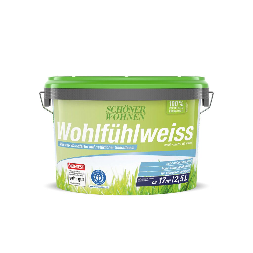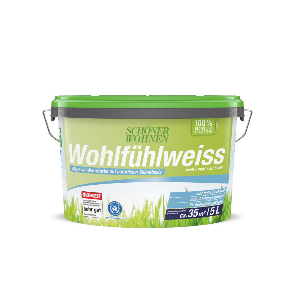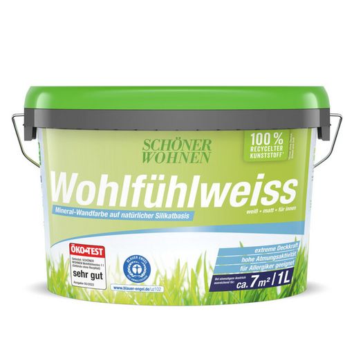 SCHÖNER WOHNEN Wohlfühlweiss ist eine hochdeckende Mineral-Wandfarbe, die aufgrund ihrer speziellen Rezeptur aus kontrollierten Rohstoffen auf Konservierungsmittel verzichten kann. Mit mineralischen Untergründen verbindet sie sich durch Verkieselung und schafft durch ihre besonders hohe Wasserdampfdiffusionsfähigkeit (Atmungsaktivität) ein angenehmes Wohnraumklima. Frei von gesundheitsschädlichen Emissionen sowie Weichmachern und Lösemitteln. SCHÖNER WOHNEN Wohlfühlweiss ist waschbeständig (Nassabriebbeständigkeit Klasse 3 nach EN 13300) und leicht zu verarbeiten. SCHÖNER WOHNEN Wohlfühlweiss – die richtige Wahl für Raufasertapeten, alte, matte Dispersionsfarbenanstriche, Kunstharzputze sowie Mauerwerk, Putz und Beton.Kontakt zum Hersteller
