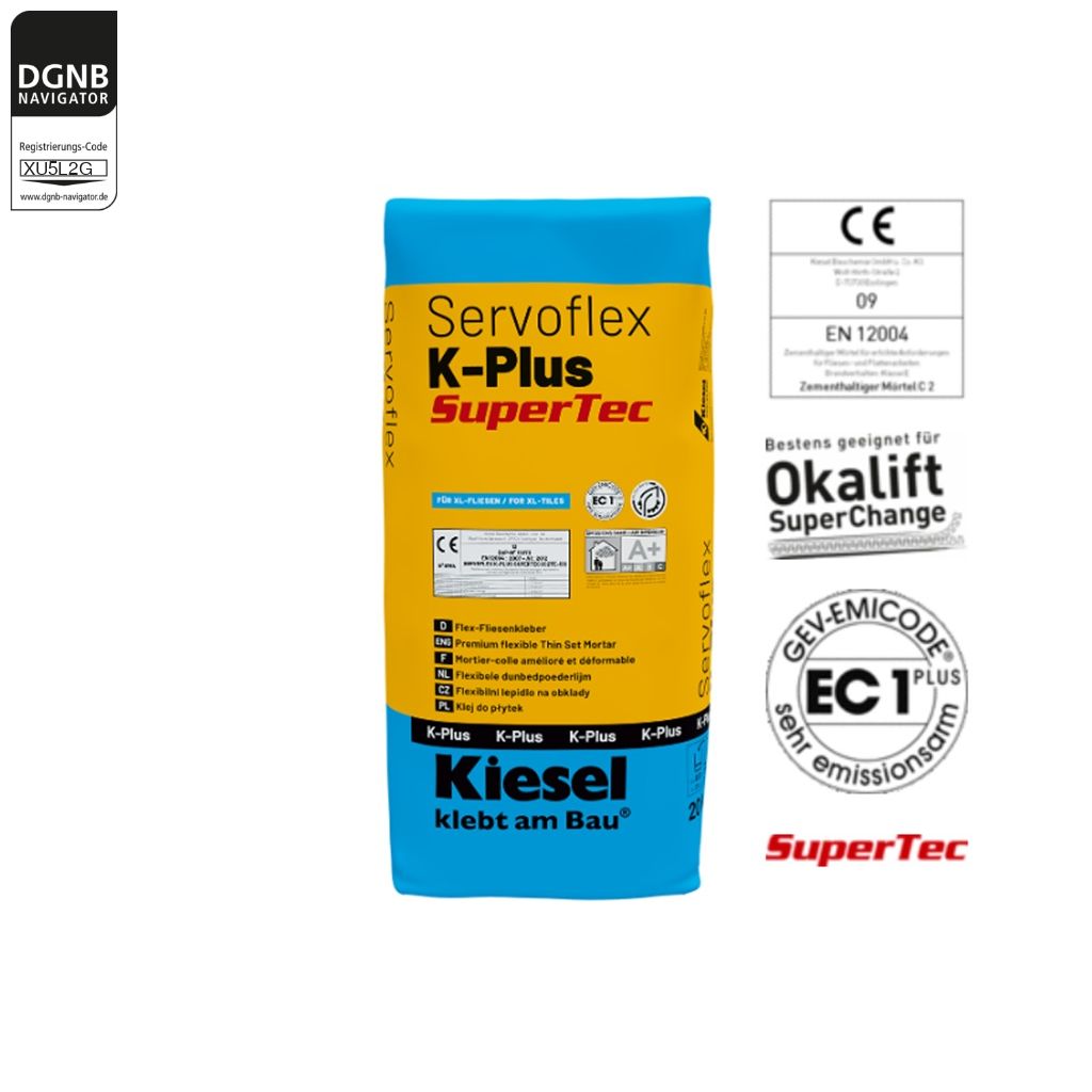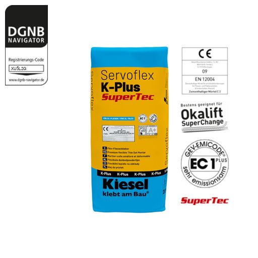 Extrem standfester, flexibler, zementärer Dünnbett- und Mittelbettmörtel zum Verlegen von keramischen Fliesen und Platten, Feinsteinzeug, Porzellanmosaik, Klinker- und Ziegelfliesen im Innen-, Außen- und Unterwasserbereich nach EN 12 004 C2 TE-S1. Beschleunigte Durchhärtung für eine sichere Verlegung in der kühlen Jahreszeit und bei der Verlegung von dichtem Belagsmaterial auf nicht saugenden Untergründen.Aufgrund der hohen Kunststoffvergütung eignet sich Servoflex K-Plus SuperTec auch für Untergründe wie Ortbeton (mind. 3 Monate alt), Gipsfaserplatten, Gipskartonplatten, Heizestriche (entsprechende Normen und Merkblätter beachten), Gussasphalt und Porenbeton sowie auf Balkonen, Terrassen und an Fassaden. Servoflex K-Plus SuperTec kann auch im Unterwasserbereich (Schwimmbecken) und als Haftbrücke zum Verlegen von im Mörtelbett anzusetzenden, entsprechend geeigneten Naturwerksteinplatten und Feinsteinzeugfliesen eingesetzt werden.